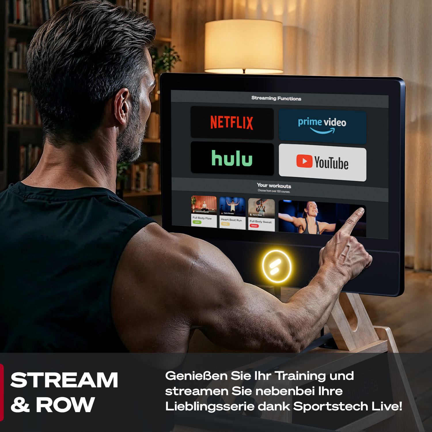 Der AquaElite ist das Premium Wasserrudergerät von Sportstech – und setzt neue Maßstäbe. Es besteht aus edlem Massivholz, verfügt über elegante Ledergriffe und bringt mit dem 21,5" HD-Touchscreen modernste Technik direkt in dein Wohnzimmer. So holst du dir das volle Sportstech Live Erlebnis nach Hause – mit geführten Workouts, beeindruckenden Landschaftsvideos, Rezepten und deinen liebsten Streaming-Diensten.