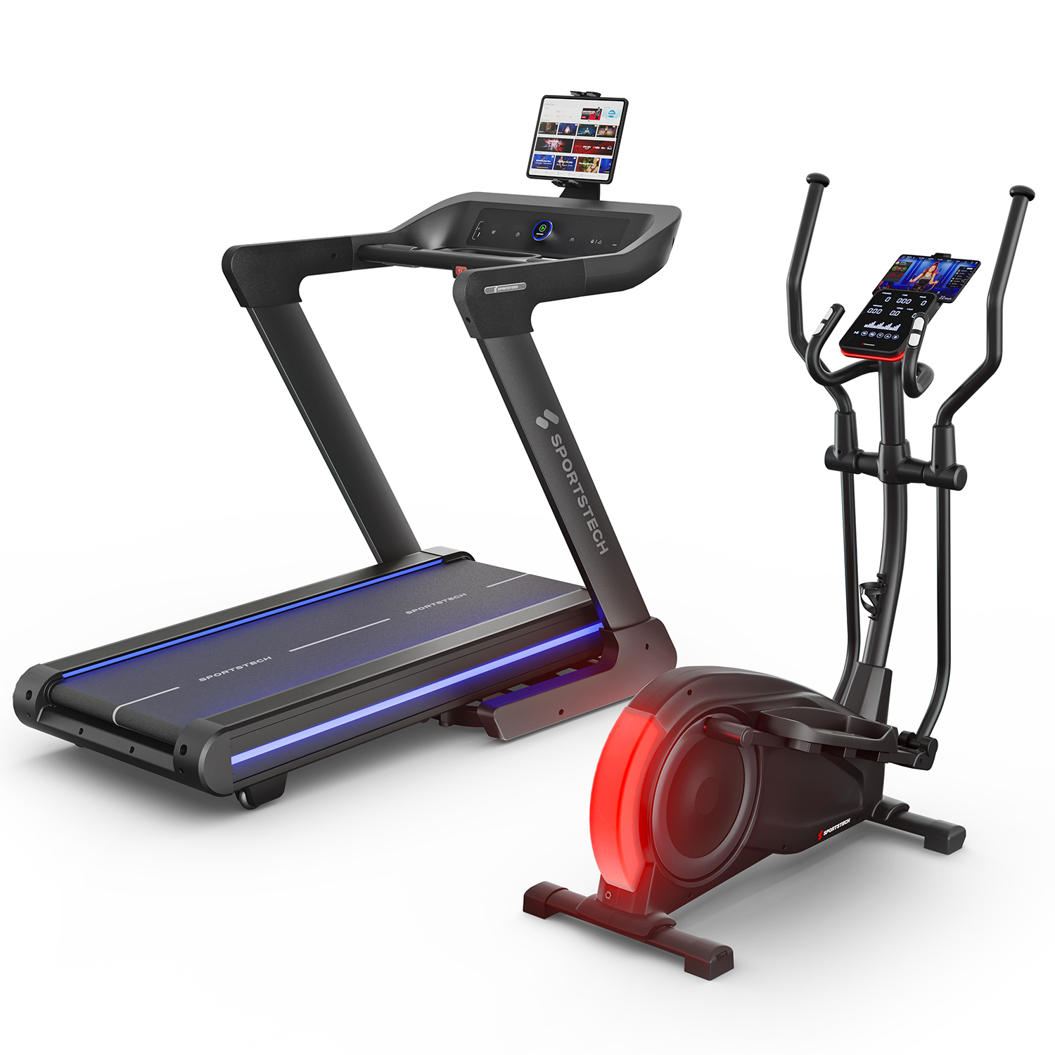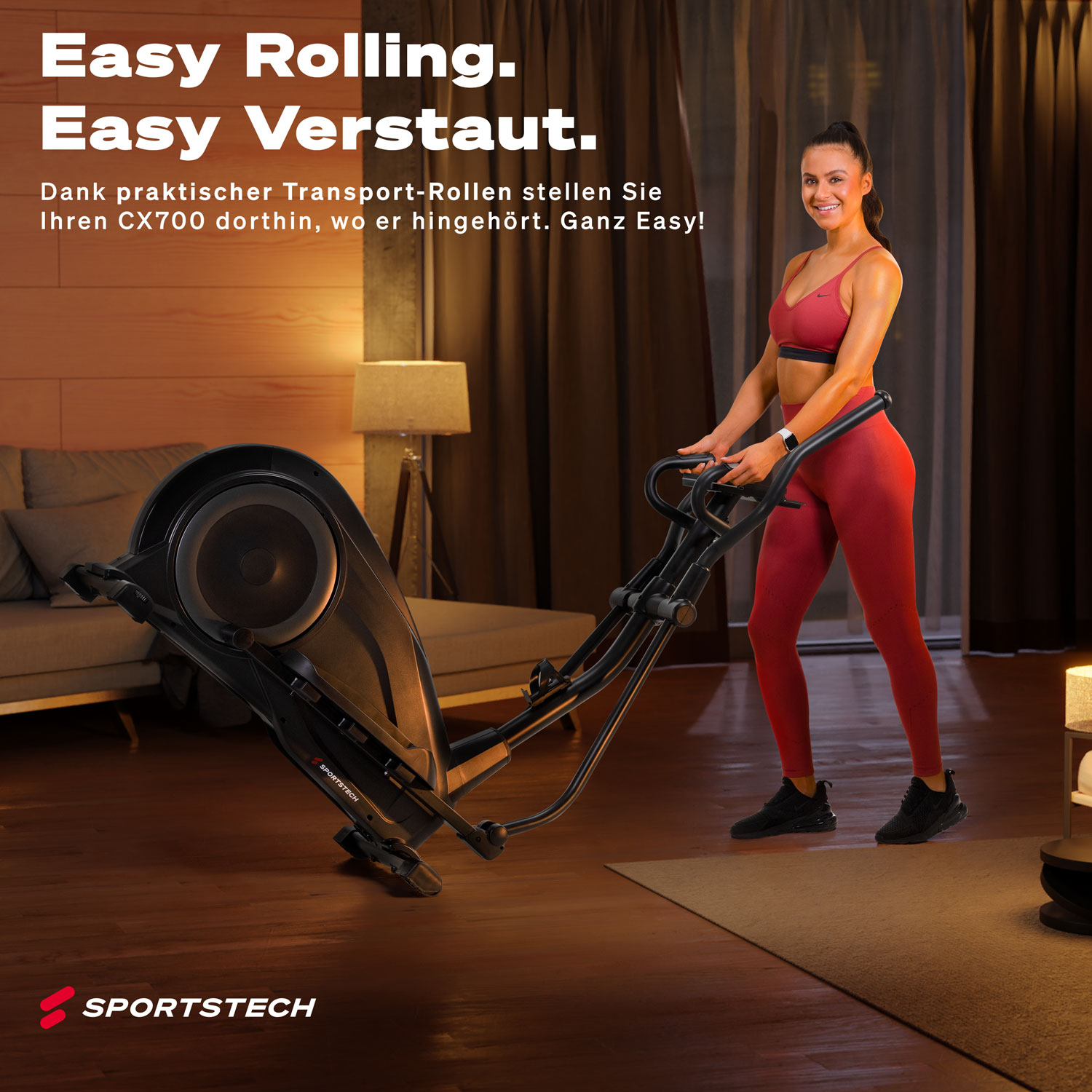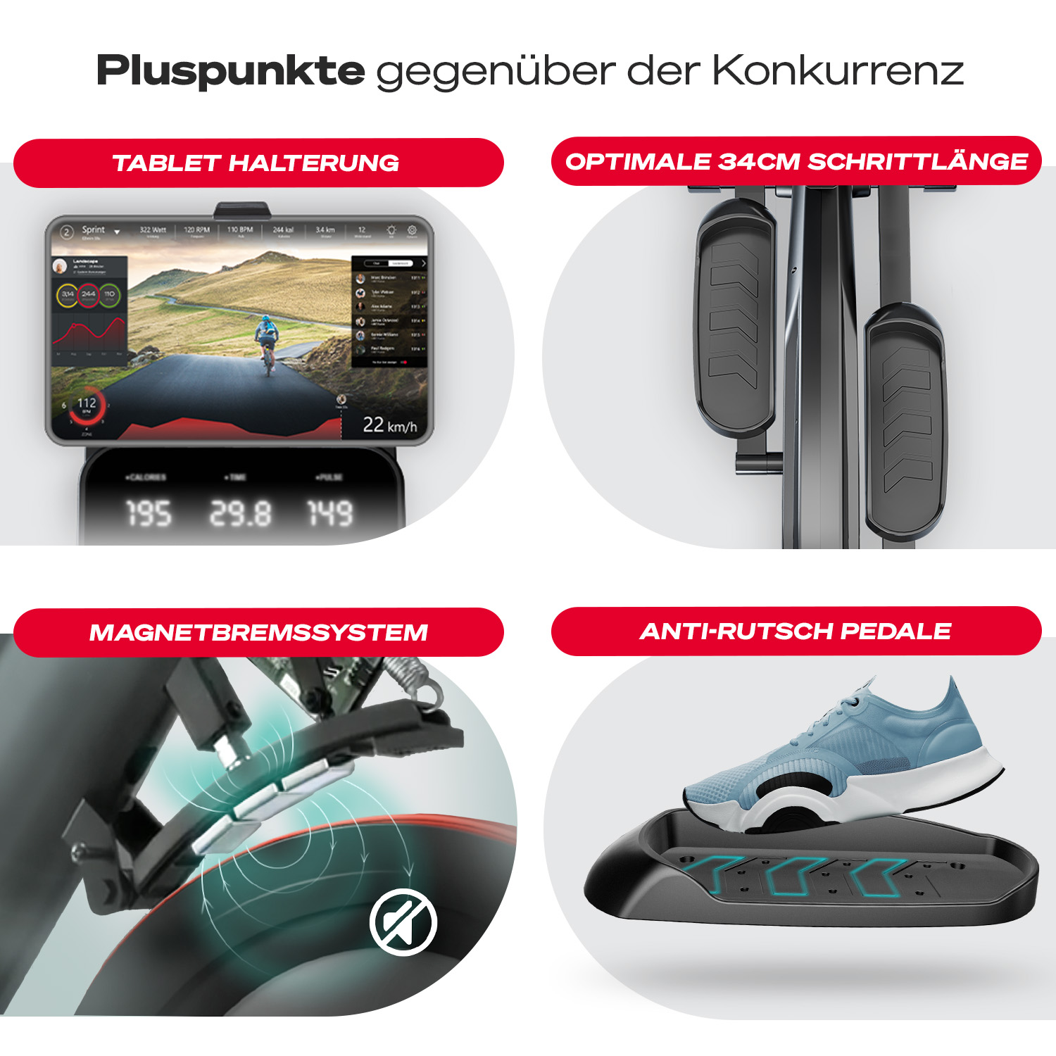 - Integrierte Handpulssensoren, Transportrollen, Halterung für Smartphone/Tablet