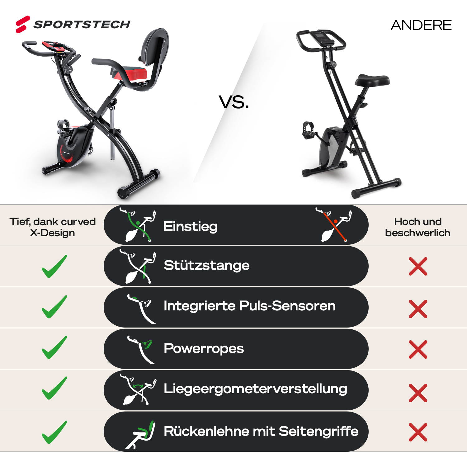 Die integrierten Power Ropes haben es in sich. Mit ihnen lassen sich der Oberkörper trainieren und Muskeln aufbauen, während beim Radfahren zeitgleich die Beine beansprucht werden. Das angenehme Tretlager ist technisch so genial konstruiert, dass sich der gewünschte Widerstand immer exakt auf die eigenen Bedürfnisse einstellen lässt. Beim Ziehen der Power Ropes vereinen sich dadurch Ausdauer- und Krafttraining. So kann man Abwechslung in jede Trainingseinheit mit dem Sportstech X150 bringen. Erfolg kommt dadurch in greifbare Nähe.