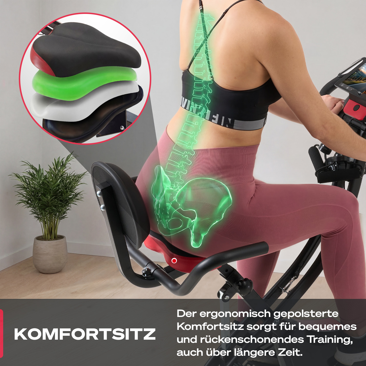 Mit dem Ergometer Sportstech X150 kann man es auch eine Nummer entspannter angehen und dabei trotzdem das Maximum aus sich herausholen. Denn mit nur einem Handgriff lässt sich aus dem vielseitigen Fitness-Bike ein Liege-Ergometer machen. Beim Training in angenehm leichter Rückenlage werden Oberschenkel und Waden ultimativ in Anspruch genommen. Diese Muskeln können dadurch rasant in neue Dimensionen gepusht werden. Zusätzlich kommt auch die Kondition nicht zu kurz. Sie kann auch im Liegen enorm gestärkt werden. Einfach zurücklehnen und fit werden.