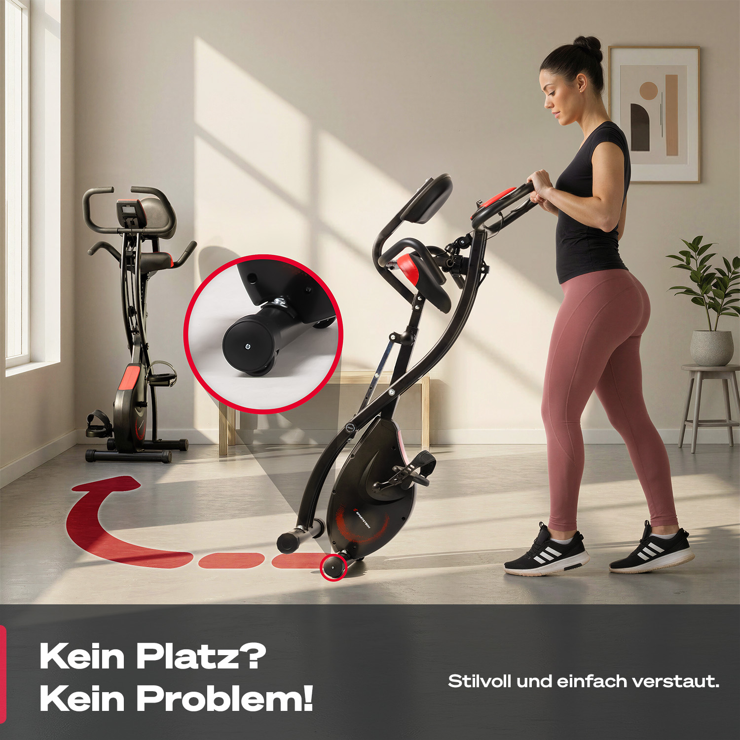 Das X150 Ergometer ist besonders leicht bewegbar und ziemlich platzsparend. Dank Quick Fold-System lässt es sich in Sekunden auf eine Stellfläche von nur 55 x 55 cm verkleinern, während das Aufstellmaß gerade mal 55,5 x 53,5 x 140 cm misst. Die eingebauten Transportrollen machen das Bewegen des hochflexiblen Hometrainers kinderleicht. So kann sich das Bike den Bedürfnissen seines Besitzers perfekt anpassen und hält sich bei Nichtgebrauch dezent im Hintergrund. Beim Training aber, kann man sich zu 100 Prozent auf die Performance des dynamischen Ergometers verlassen.