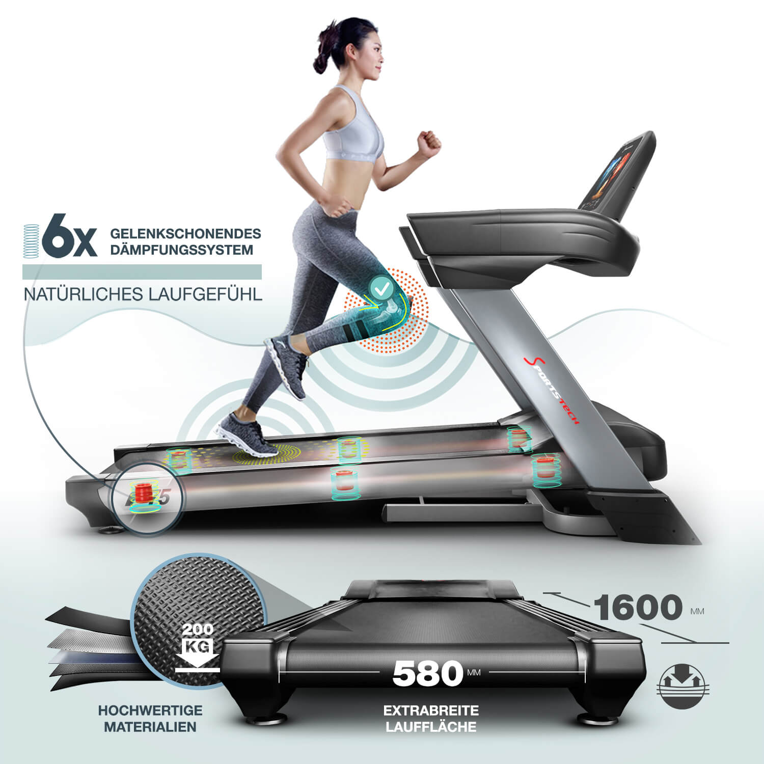 Im direkten Vergleich zu vielen handelsüblichen Laufbändern bietet das F75 entscheidende Vorteile: Während viele Modelle bei 16 km/h enden und keine Steigungsfunktion besitzen, erreicht das F75 bis zu 20 km/h und bietet eine automatische Steigung von bis zu 11 %. Zusätzlich ist die Sportstech Live App bereits vorinstalliert und ermöglicht ein digitales Trainingsökosystem, was bei vielen anderen Laufbändern nicht oder nur eingeschränkt vorhanden ist. Dadurch ist das Training deutlich vielseitiger, intensiver und langfristig motivierender.