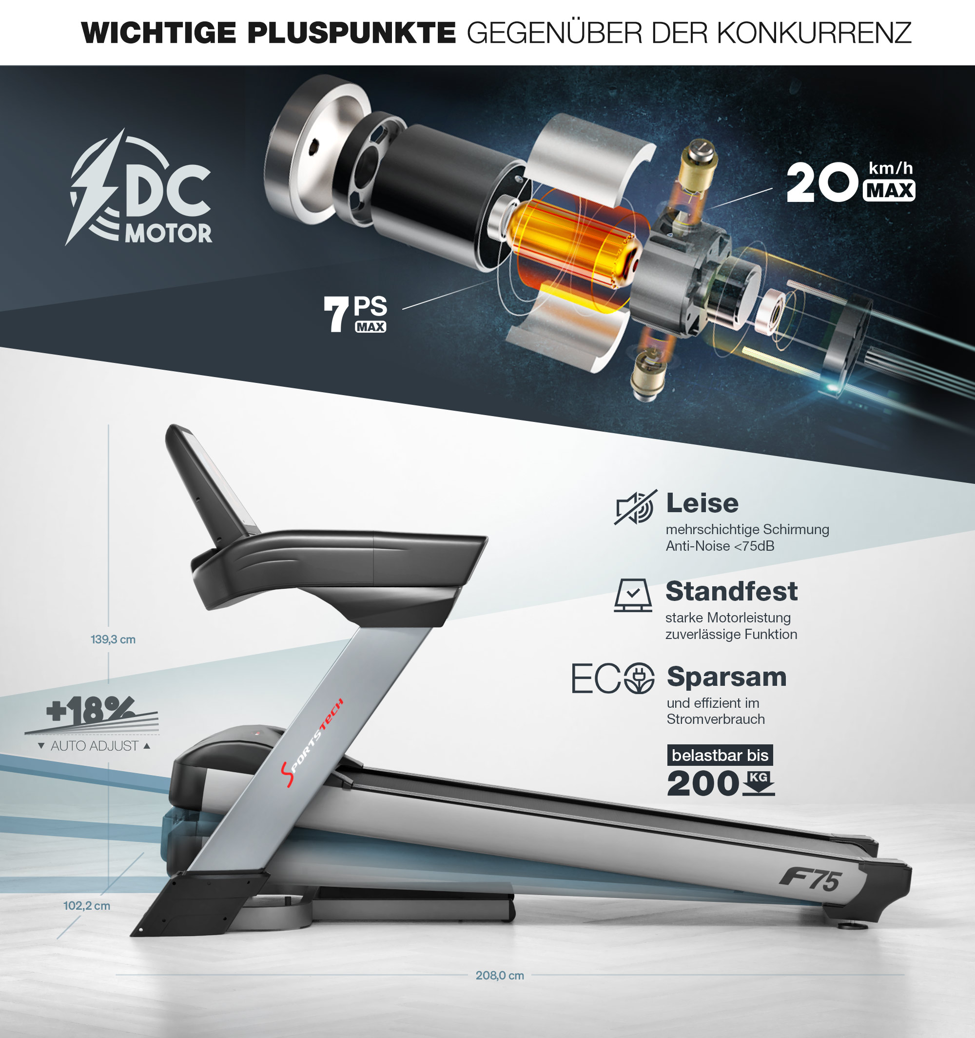 Das F75 verfügt über einen kraftvollen 5-PS-Motor und erreicht eine maximale Geschwindigkeit von bis zu 20 km/h. Für ein abwechslungsreiches und intensives Training stehen 18 automatische Steigungsstufen bis 11 % zur Verfügung. Dadurch lassen sich sowohl gleichmäßige Ausdauereinheiten als auch anspruchsvolle Intervall- oder Bergtrainings realisieren.