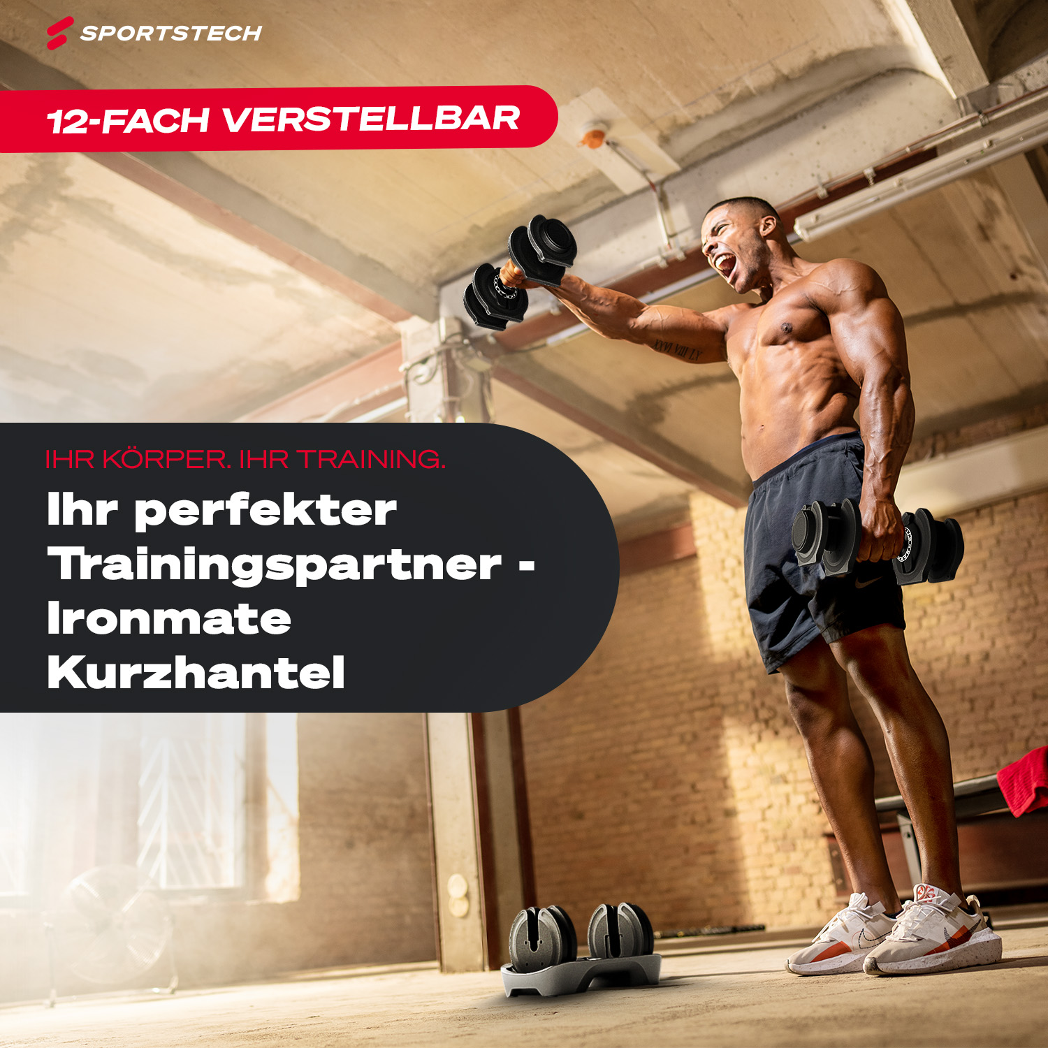 Mit der verstellbaren Ironmate Kurzhantel brauchst du dir keine Gedanken mehr über lose Hanteln oder herumliegende Gewichte zu machen. Sie bietet dir alle Gewichtseinstellungen auf nur einer Hantel, die du für dein Krafttraining benötigst.