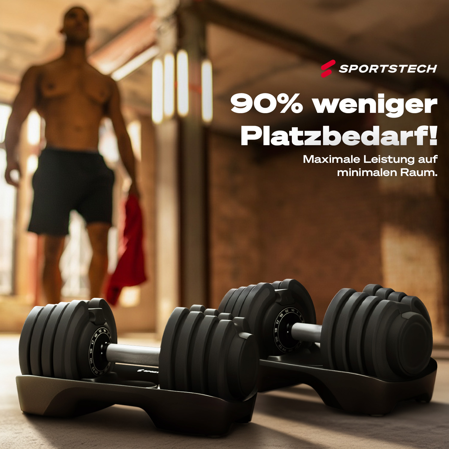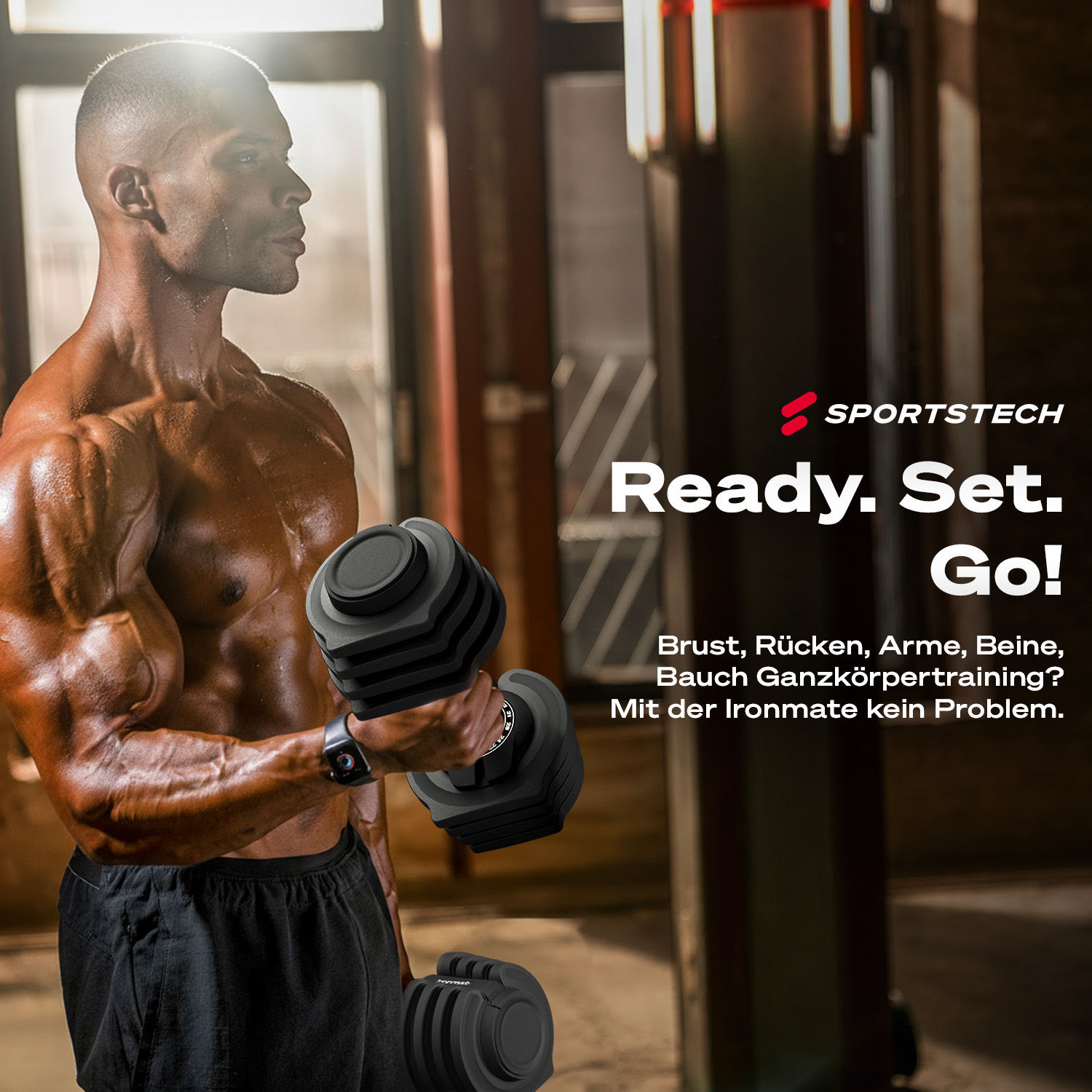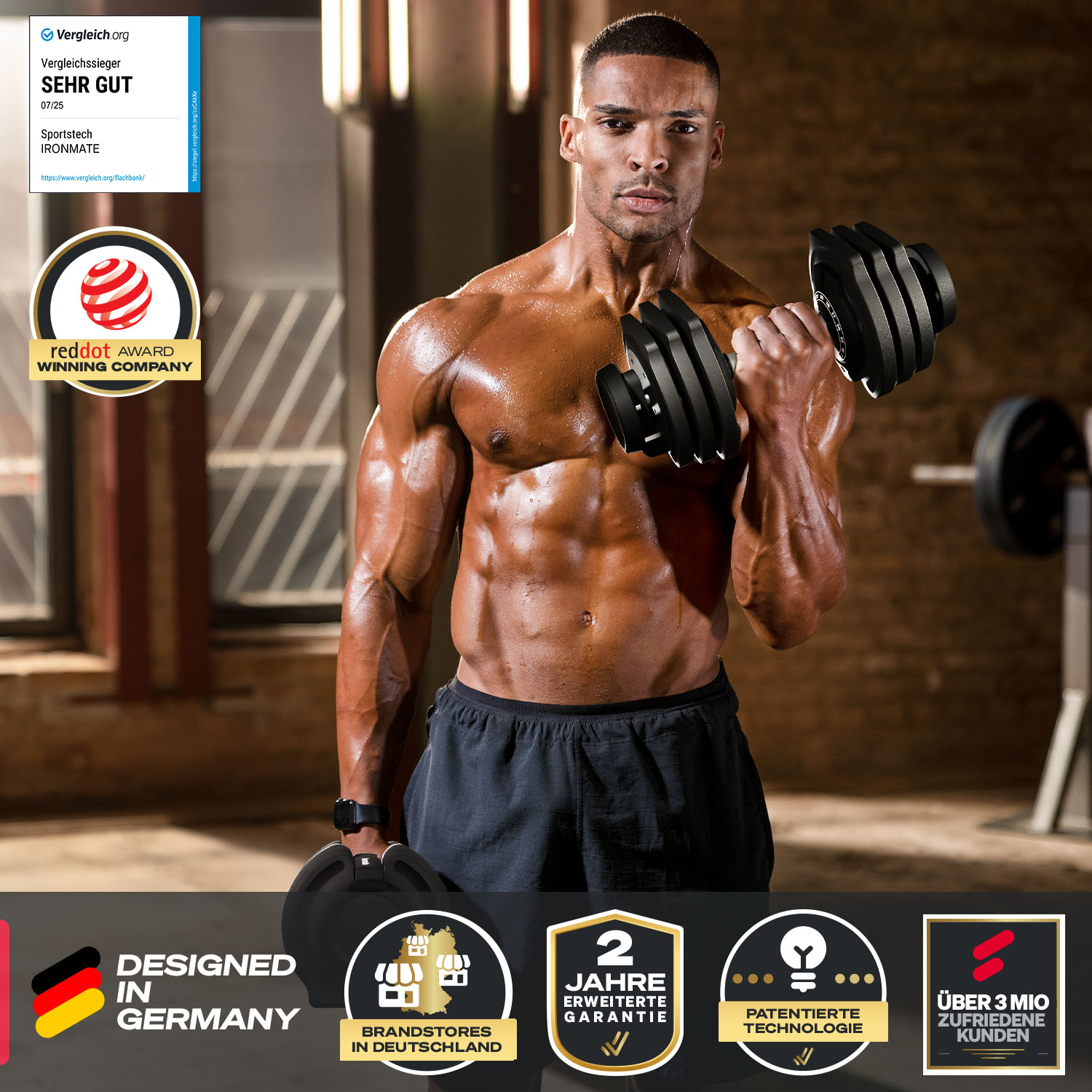 Die Ironmate Kurzhantel überzeugt durch Ihr kompaktes Design. Du musst nicht viel Platz haben und dich nicht Sorgen um herumliegende, lose Hantelscheiben oder Verschlüsse. Das Gewicht kannst du in einer Sekunde einstellen. Während andere Hanteln in 5 kg Abständen kommen (5, 10, 15, 20 usw.), kannst du hier das Gewicht viel präziser und höher einstellen.