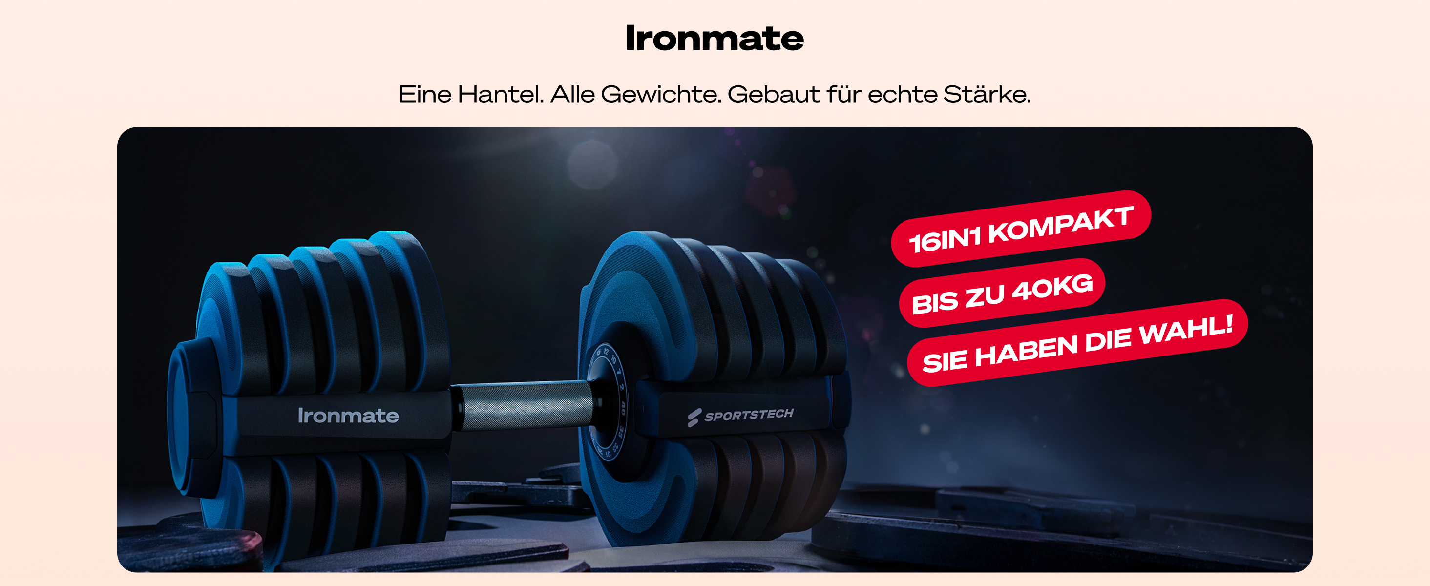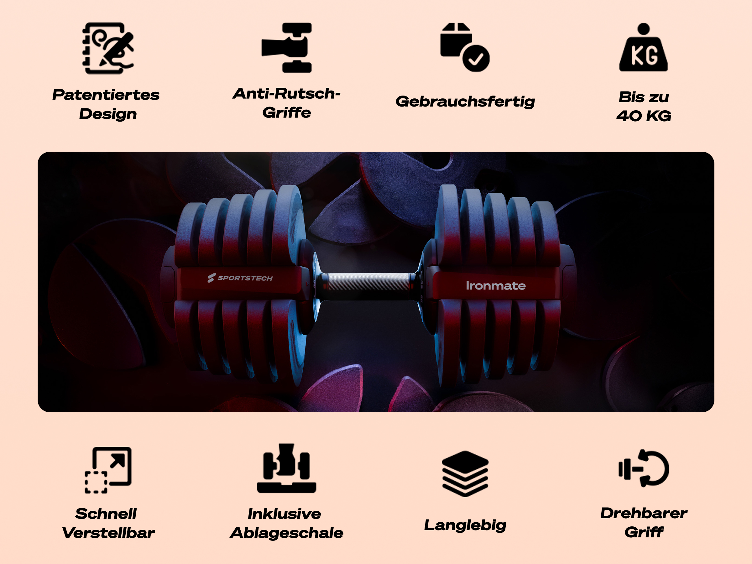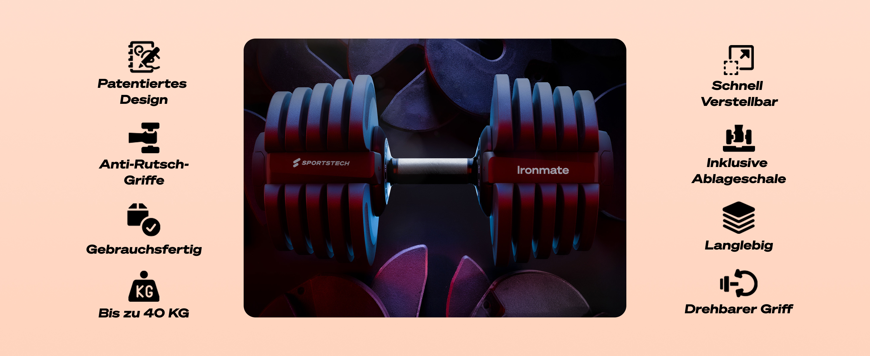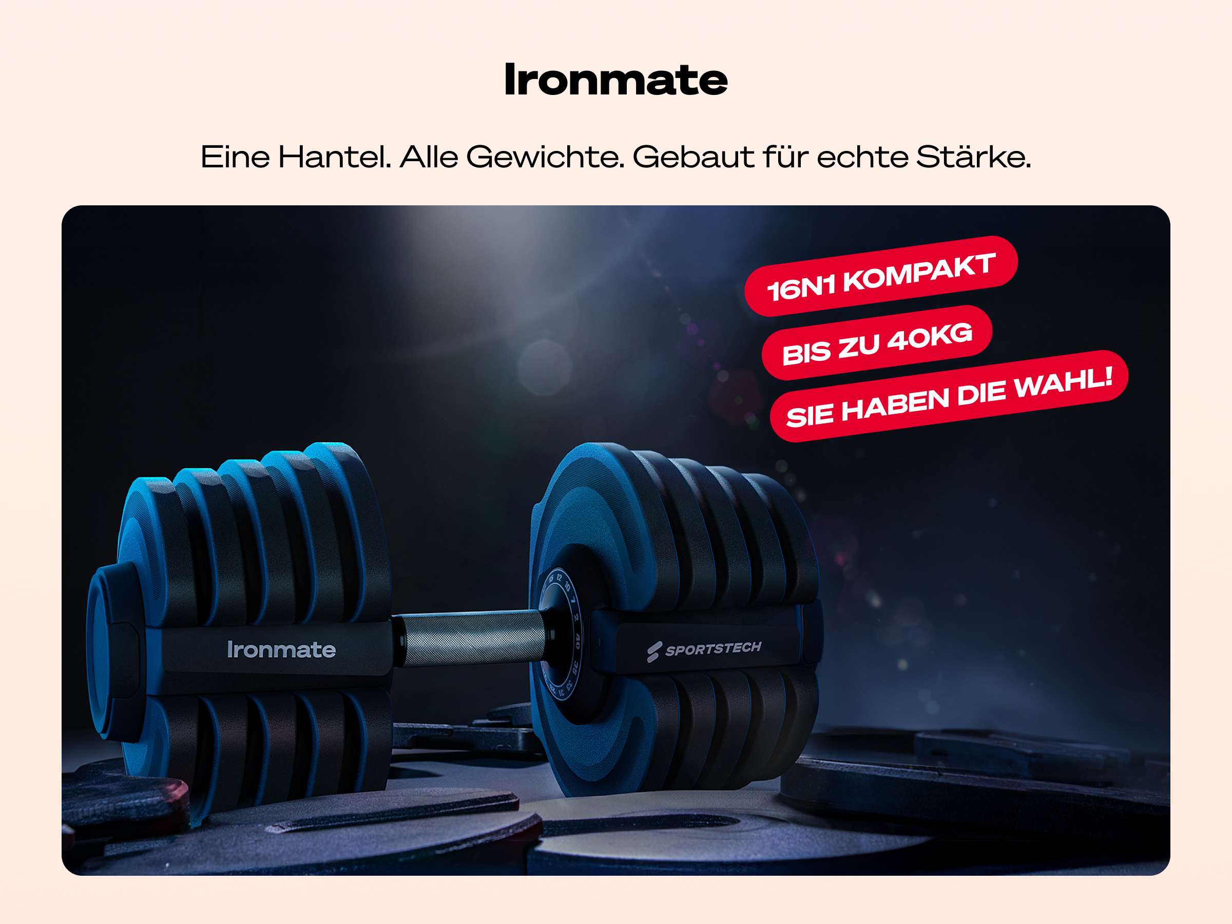 Die Ironmate Kurzhantel überzeugt durch Ihr kompaktes Design. Du musst nicht viel Platz haben und dich nicht Sorgen um herumliegende, lose Hantelscheiben oder Verschlüsse. Das Gewicht kannst du in einer Sekunde einstellen. Während andere Hanteln in 5 kg Abständen kommen (5, 10, 15, 20 usw.), kannst du hier das Gewicht viel präziser und höher einstellen.