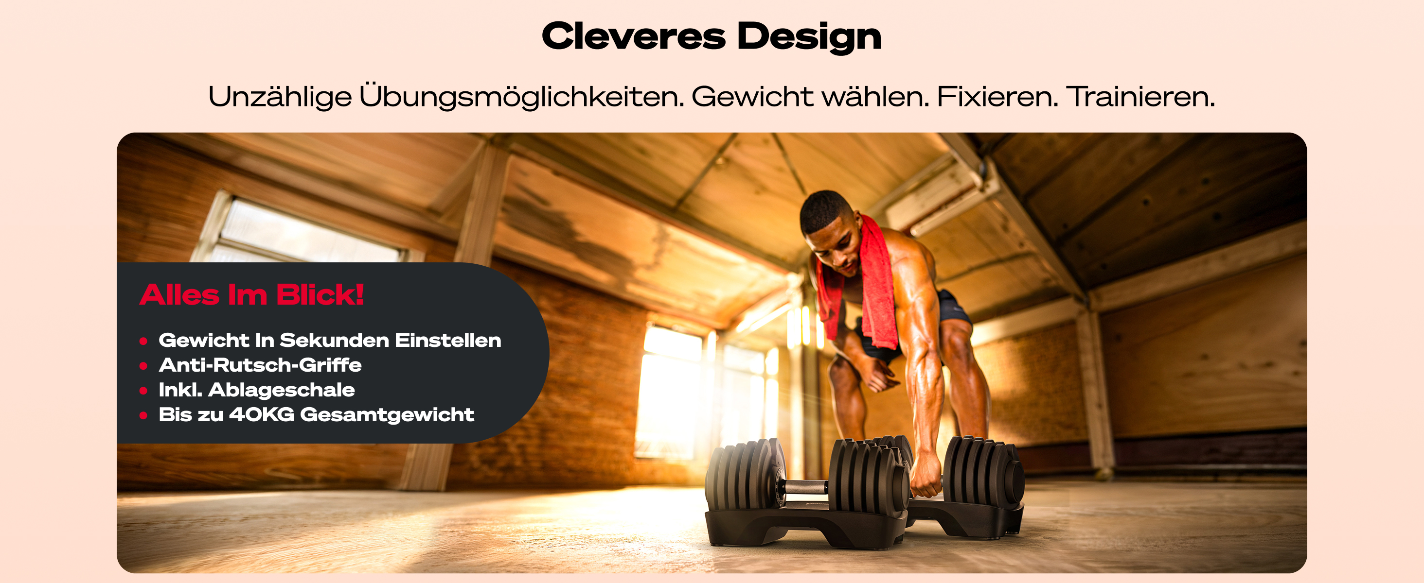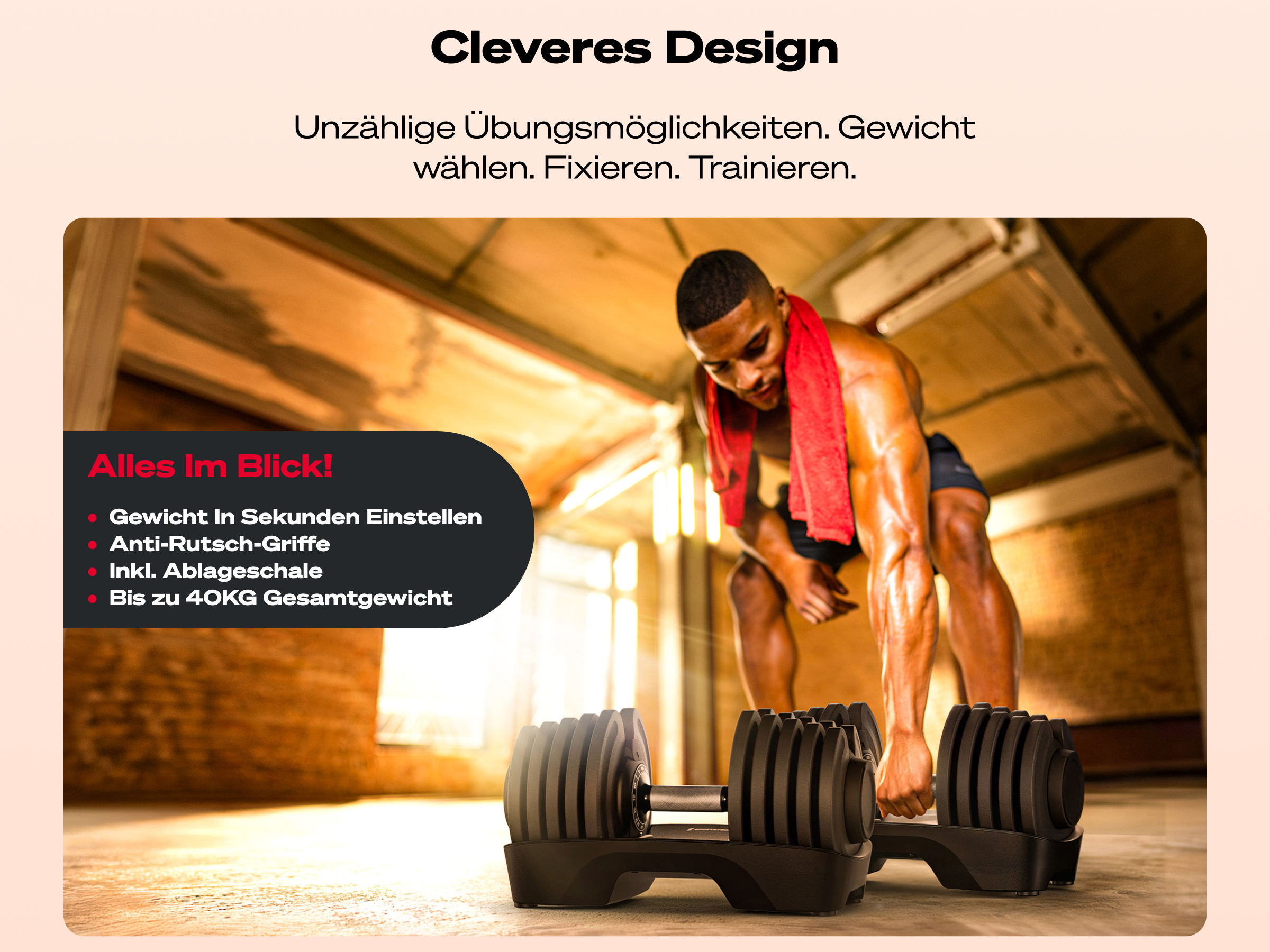 - Gewicht wird über den verstellbaren Hantelgriff in Sekunden eingestellt