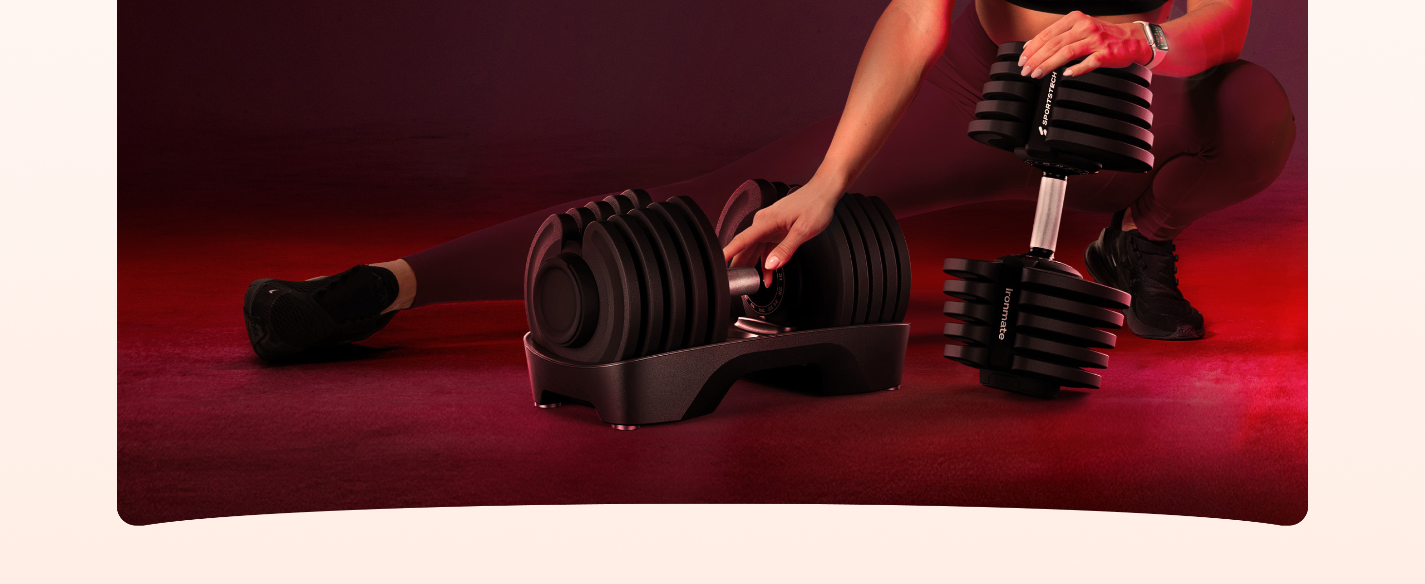 Die Gewichtseinstellung ist immer ausschließlich in der Ablage möglich. Sobald die Hantel angehoben wird, werden die ausgewählten Gewichtsplatten automatisch verriegelt und bleiben fest fixiert.