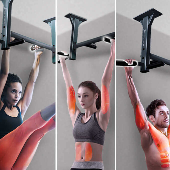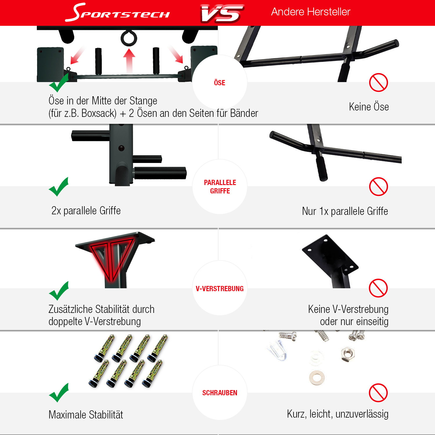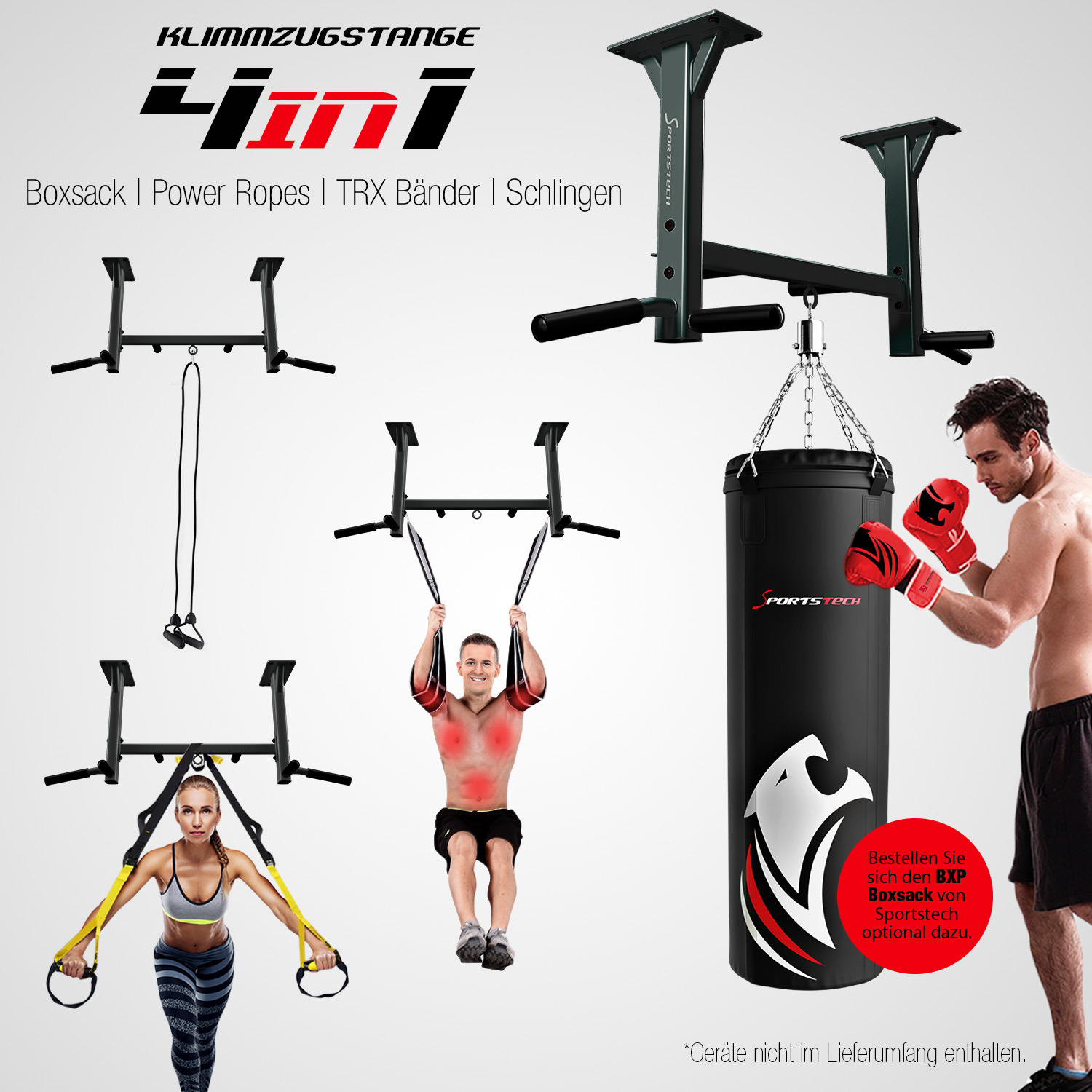 Das Training an einer Klimmzugstange ist unglaublich vielseitig. Neben dem herkömmlichen Klimmzug, bei dem schon extrem viele Muskel auf einmal zum Einsatz kommen, können Sie auch diverse Bein- und Bauchübungen an ihr durchführen. Aber da, uns von Sportstech, das an Vielseitigkeit noch nicht reicht, haben wir die KS400 so gebaut, dass Sie mit ihr Ihren Trainingsplan durch unzählig viele Übungen erweitern können. So haben wir die KS400 zum Beispiel mit Ösen versehen, die das Einhängen eines Boxsackes möglich machen oder ein Training mit Power Ropes, TRX Bändern oder Schlingen bieten.