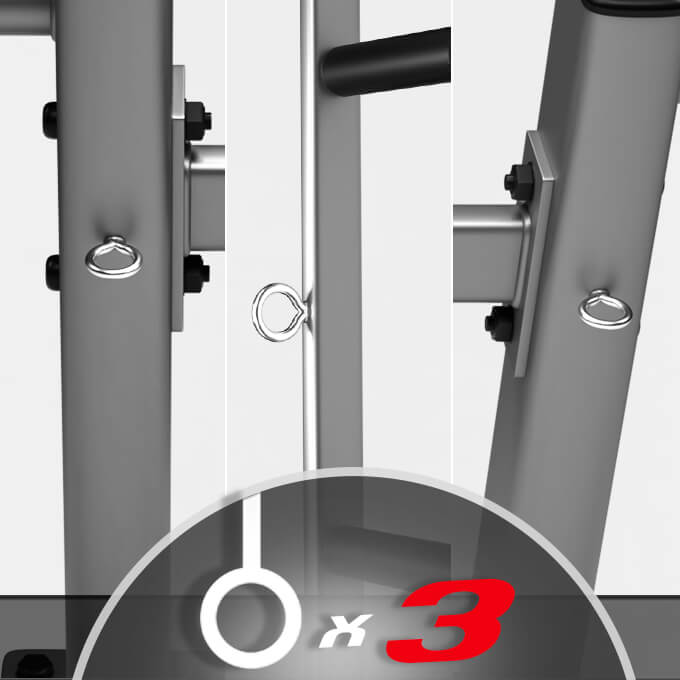 Unser Anspruch ist es, unsere Geräte so zu konzipieren, dass sie möglichst vielfältig einsetzbar sind. Deswegen haben wir unsere KS400 mit praktischen Ösen ausgestattet. Die Mittlere ermöglicht das Einhängen eines Boxsackes, die zwei Äußeren bieten Ihnen ein Training mit Schlingen, TRX Bändern oder Power Ropes.