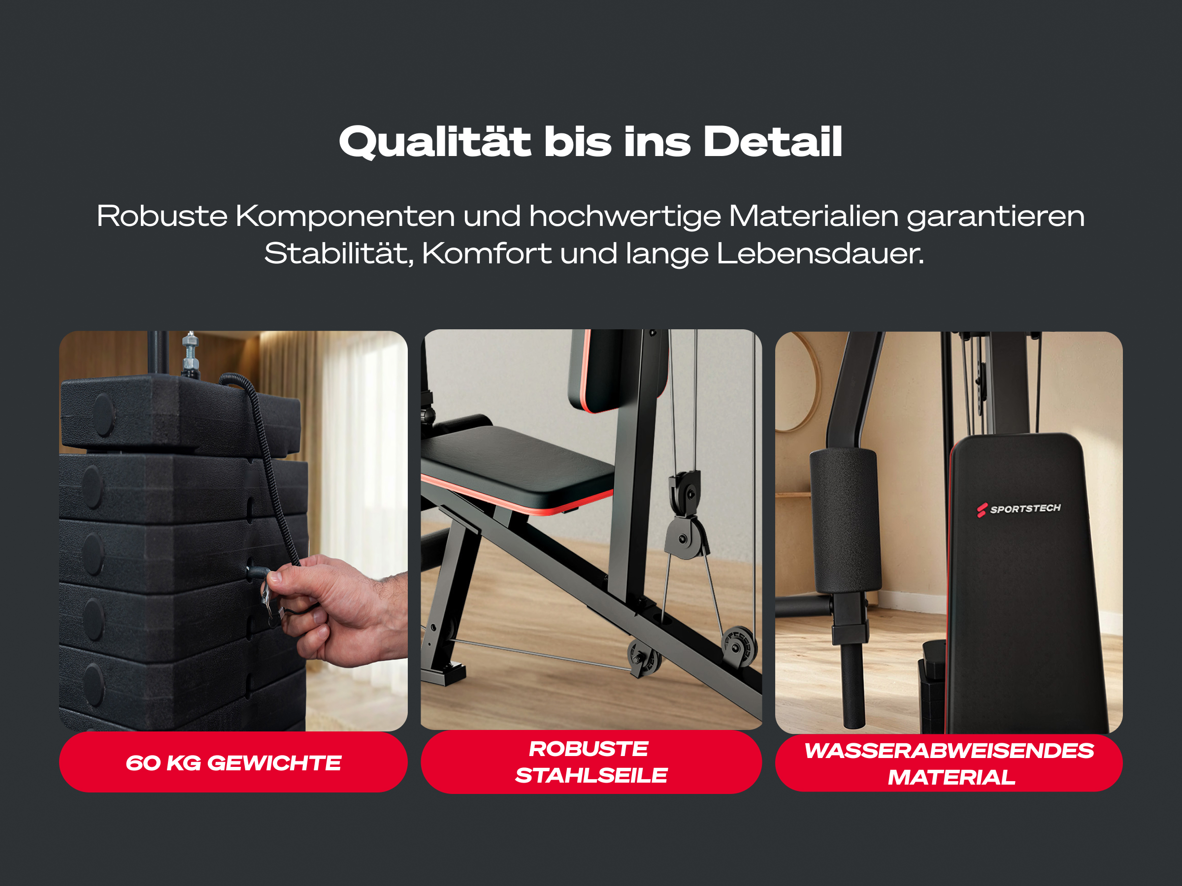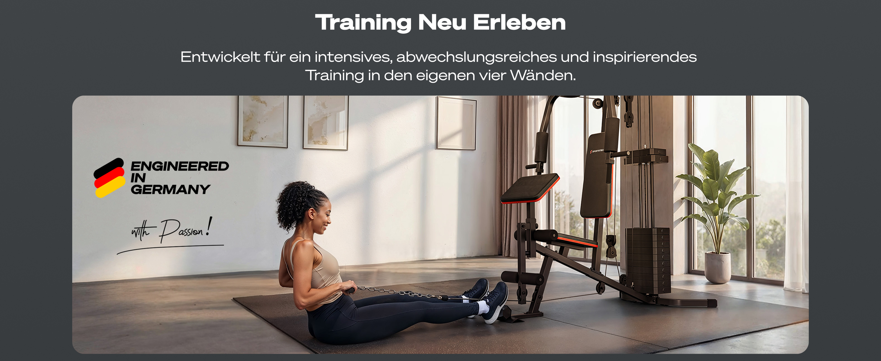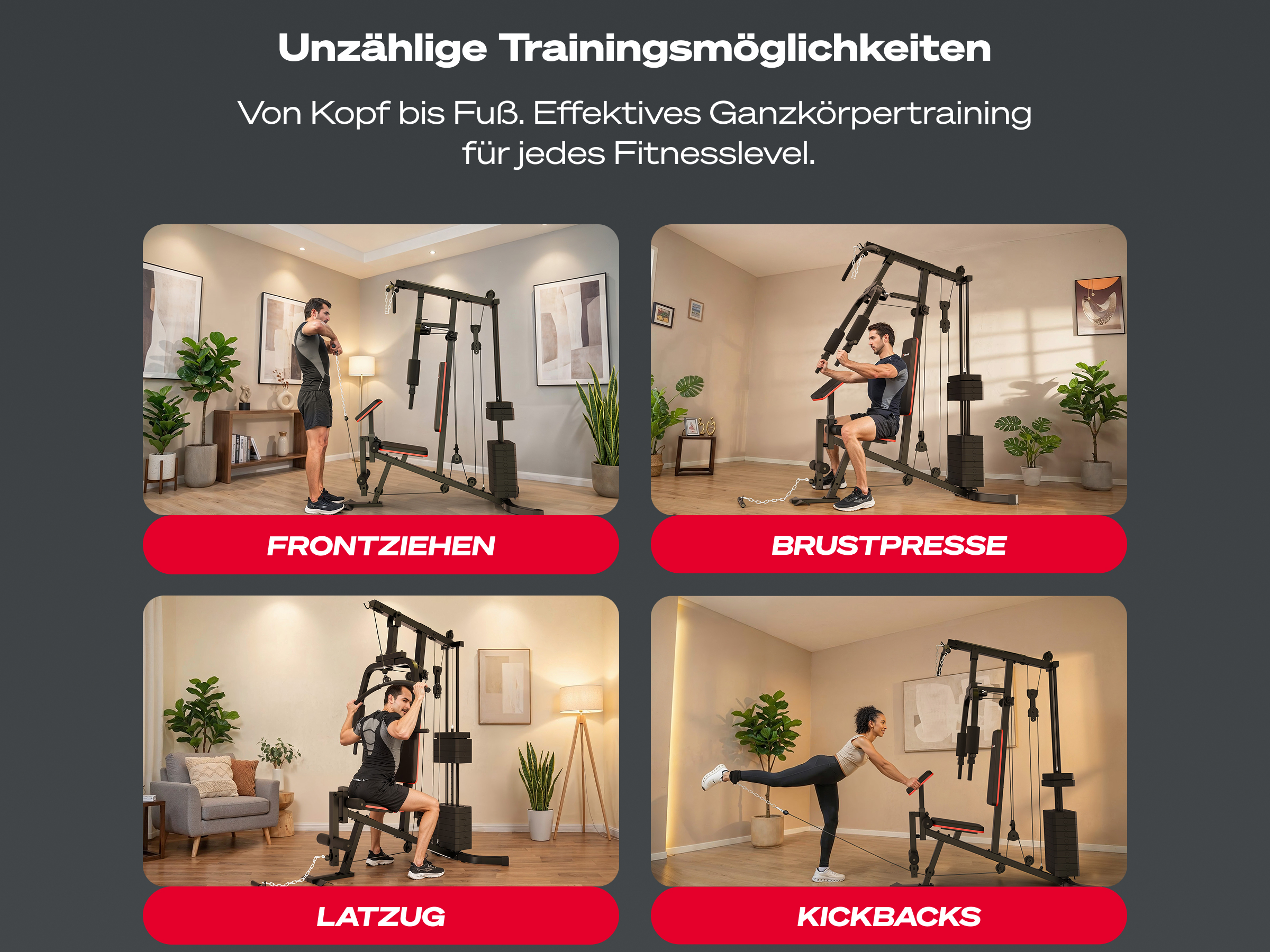 Eine Kraftstation ist ein multifunktionales Fitnessgerät, das speziell für das Ganzkörpertraining entwickelt wurde. Sie bietet die Möglichkeit, alle Muskelgruppen zu Hause effektiv zu trainieren – von der Brust- und Rückenmuskulatur über die Arme bis hin zu den Beinen.