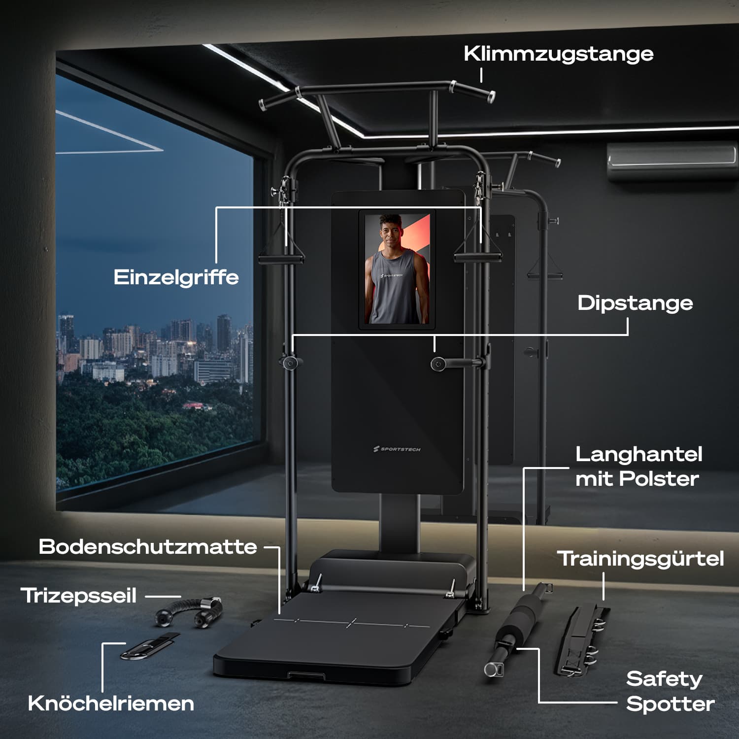 - Inklusive Klimmzugstange, Dipbar, Gewichtsgürtel, Trizepsseil, 2× Einzelgriffe, 2x Verlängerungen, Langhantel und Schlaufe für Kickbacks