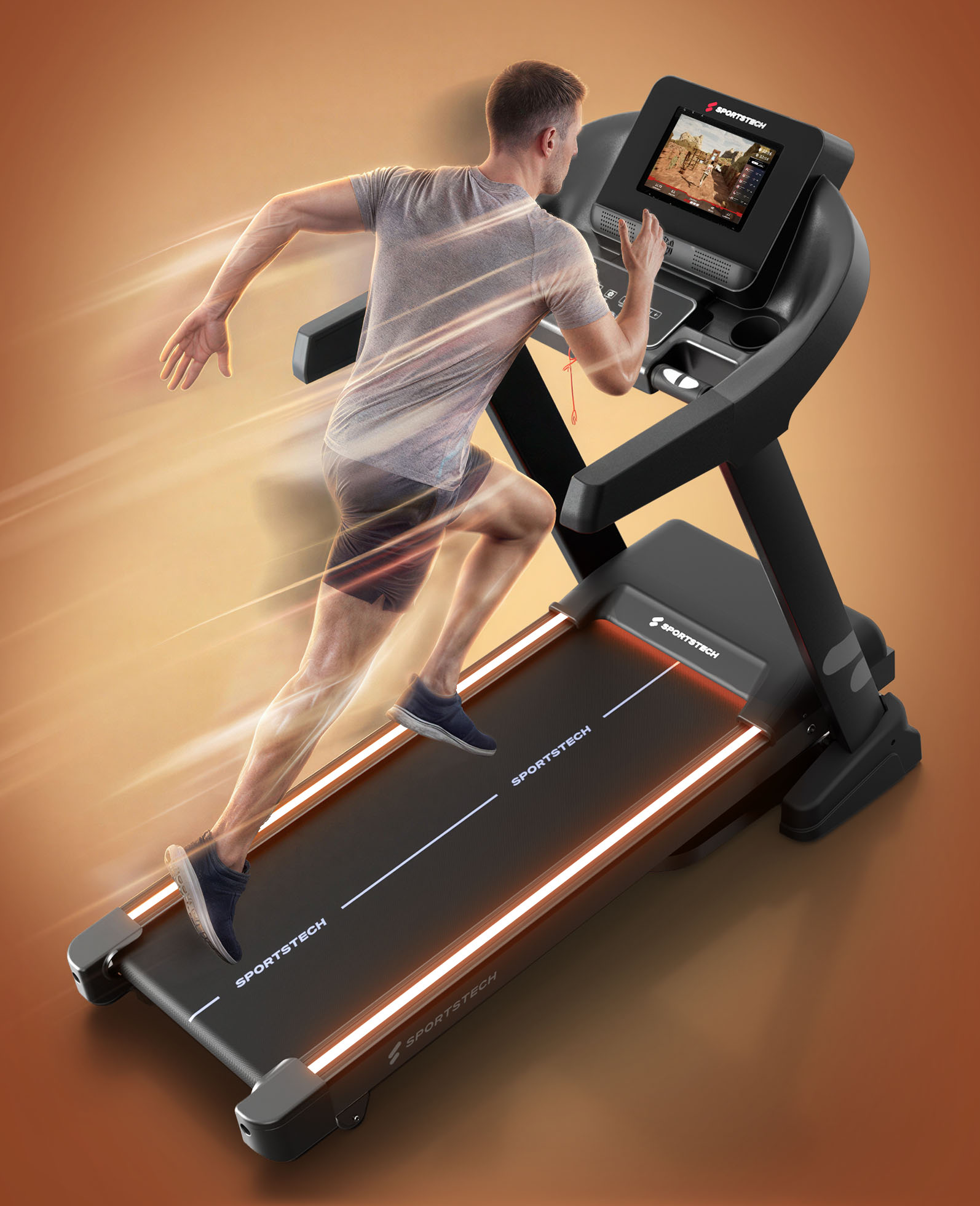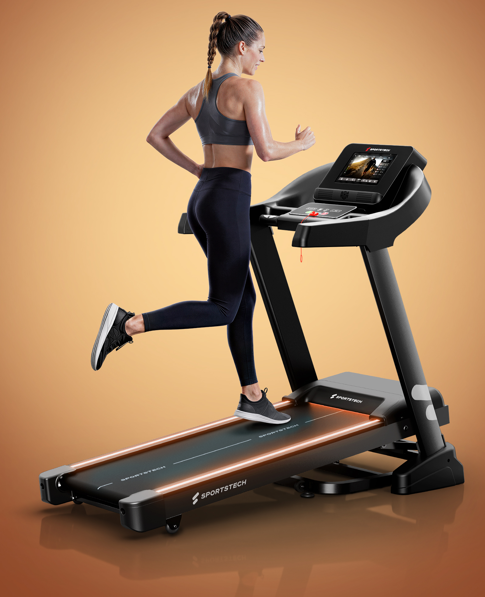 - Touchscreen: Integrierter 10,1"-Touchscreen für intuitive Bedienung und interaktives Training direkt am Laufband.