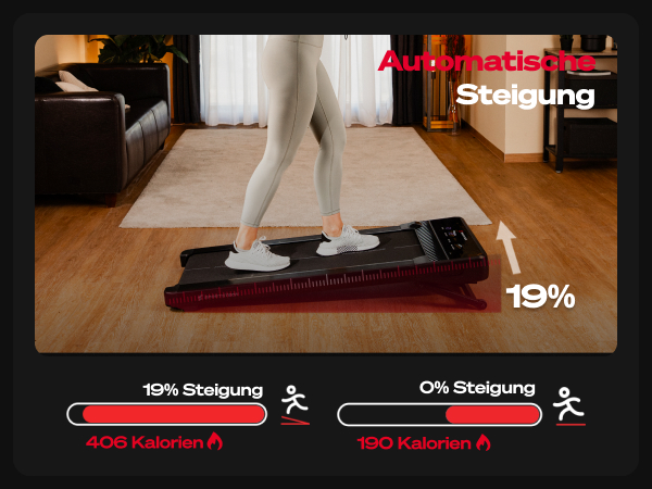 Das Walking Pad verfügt über eine automatische Steigungsfunktion mit 5 Stufen bis zu 19 %, die bequem über die Fernbedienung eingestellt werden kann. Diese Funktion ermöglicht es, die Intensität des Trainings individuell anzupassen.