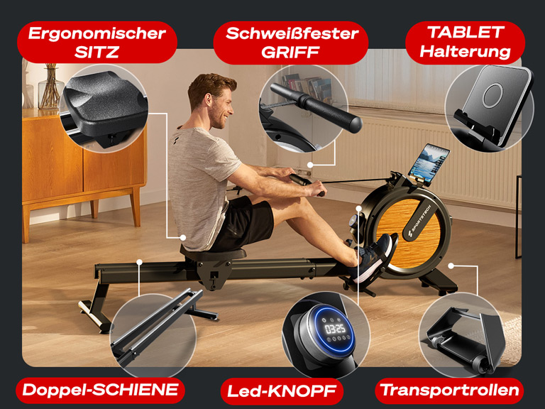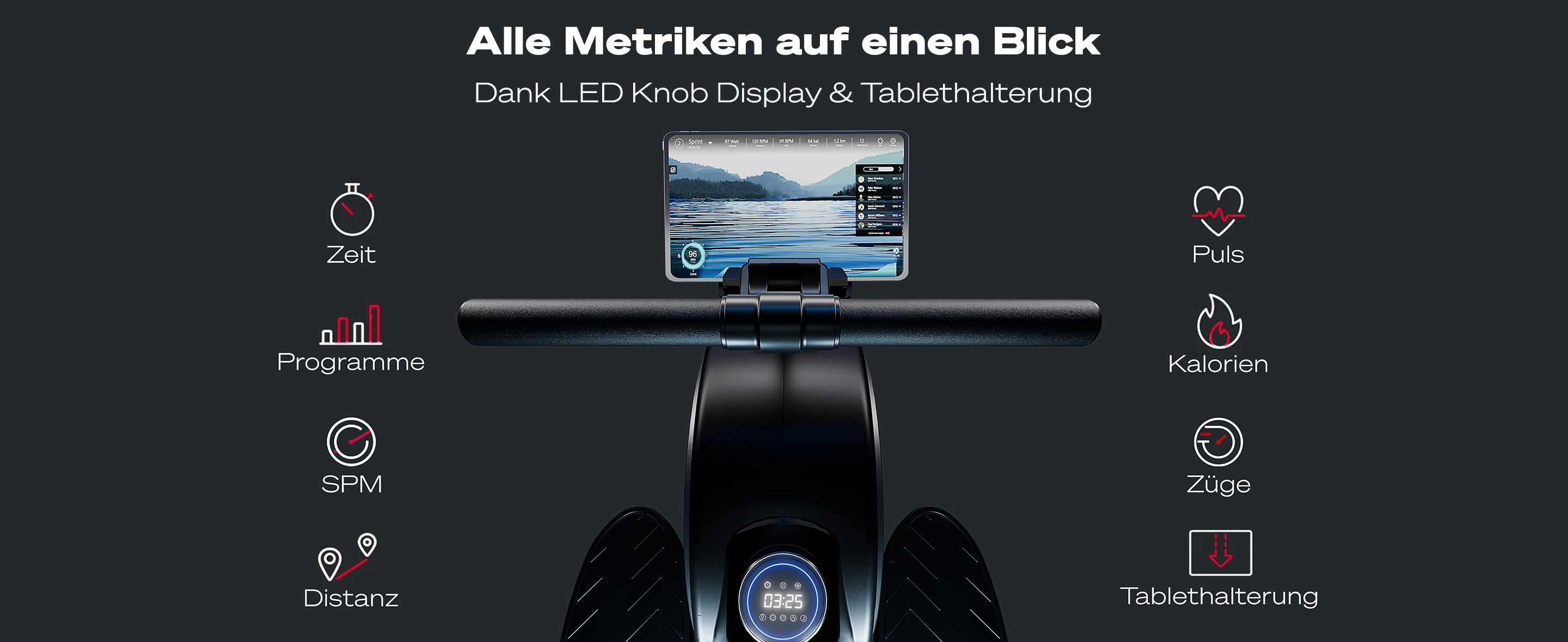 Das innovative LED-Knob-Display zeigt dir immer alle wichtigen Leistungsdaten an: Zeit, Distanz, Puls, Watt, SPM (Züge pro Minute), Kalorien, Widerstandsstufen (32 Stufen verfügbar)