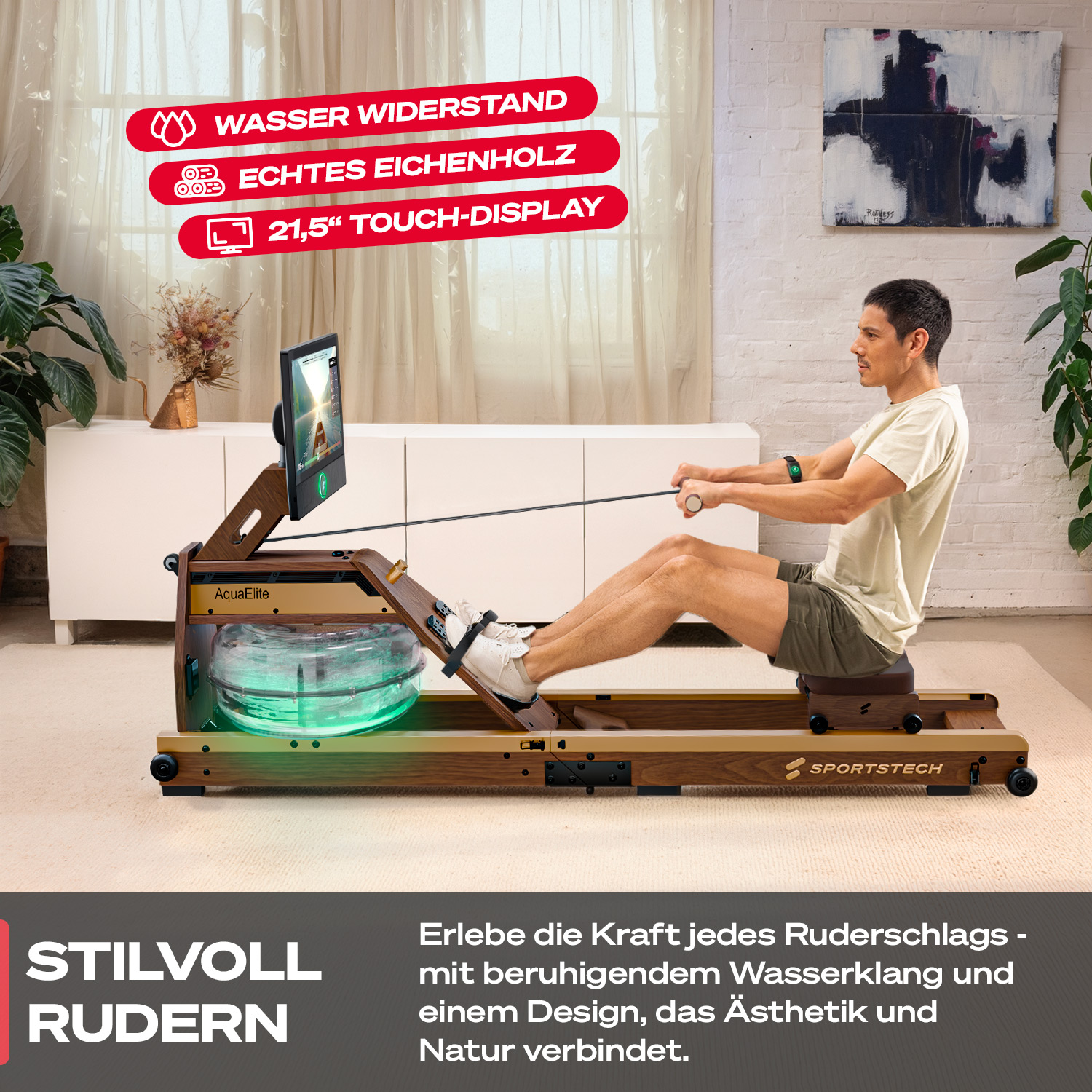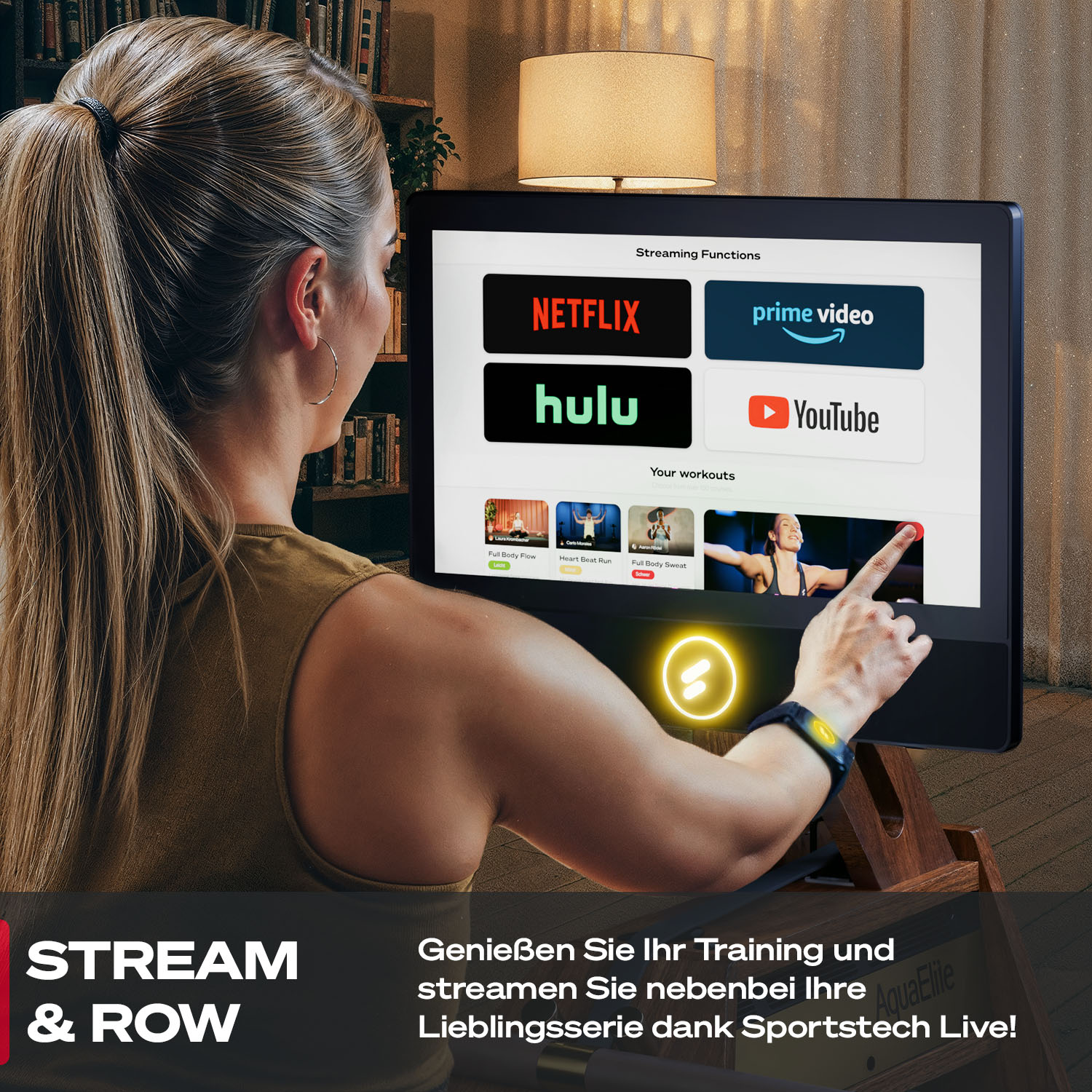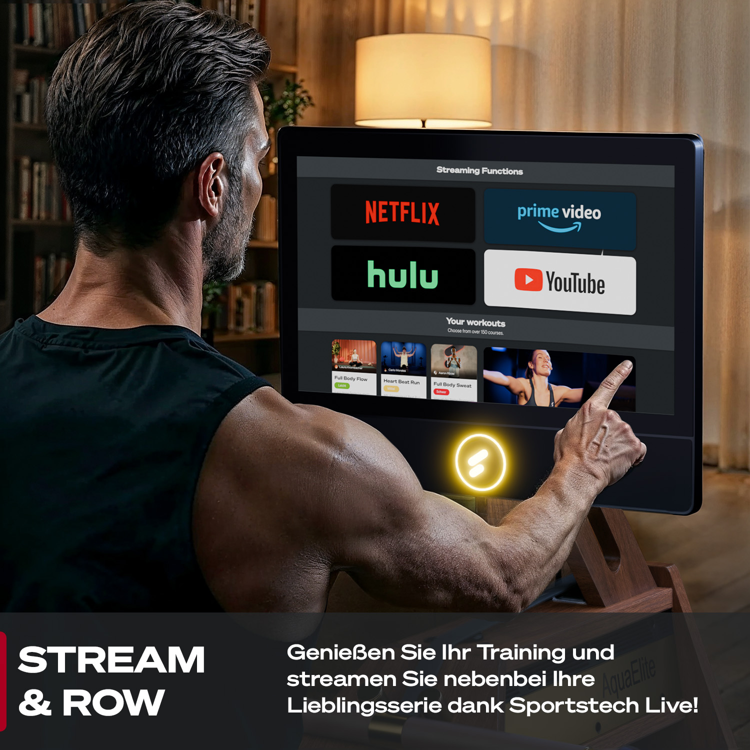 Der AquaElite ist das Premium Wasserrudergerät von Sportstech – und setzt neue Maßstäbe. Es besteht aus edlem Massivholz, verfügt über elegante Ledergriffe und bringt mit dem 21,5" HD-Touchscreen modernste Technik direkt in dein Wohnzimmer. So holst du dir das volle Sportstech Live Erlebnis nach Hause – mit geführten Workouts, beeindruckenden Landschaftsvideos, Rezepten und deinen liebsten Streaming-Diensten.