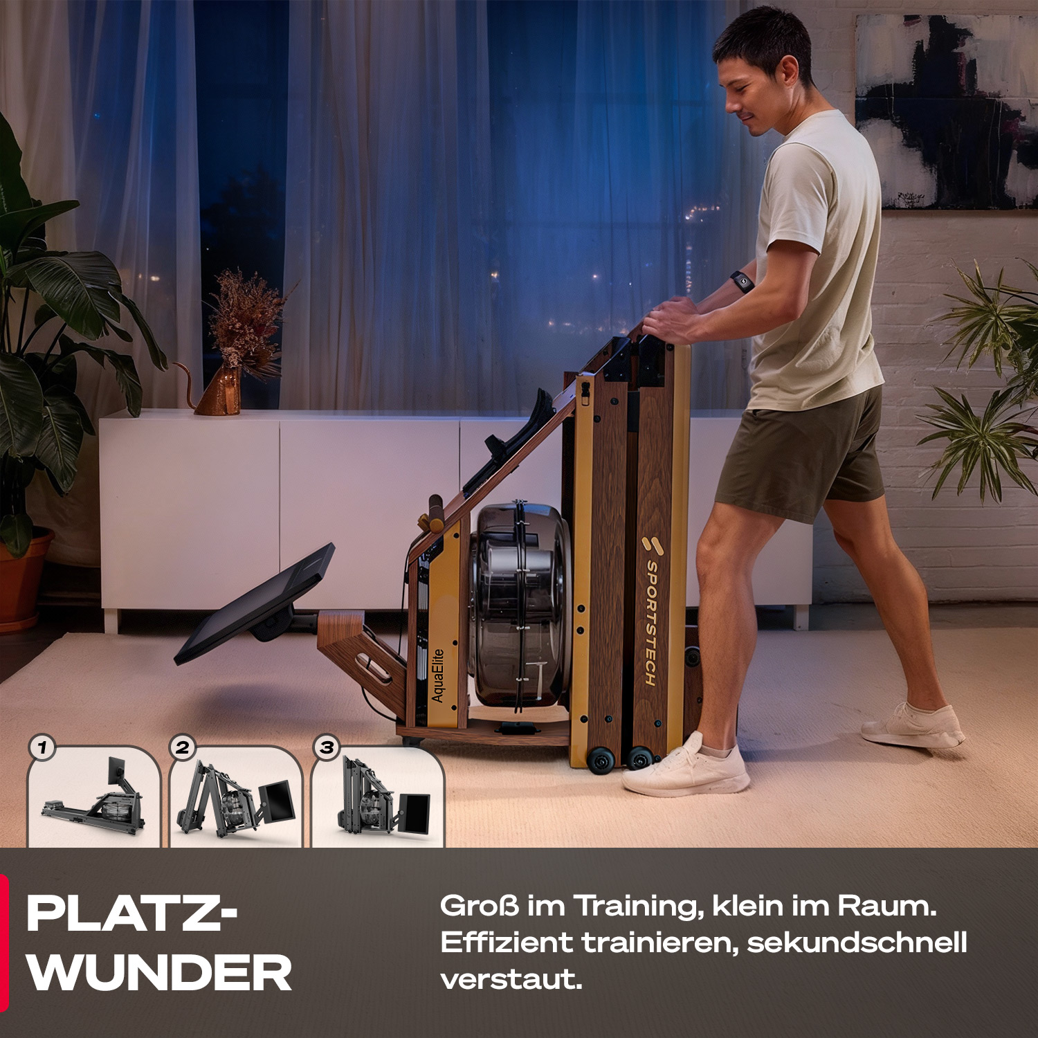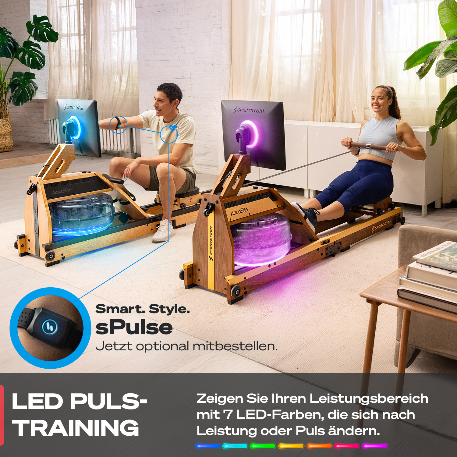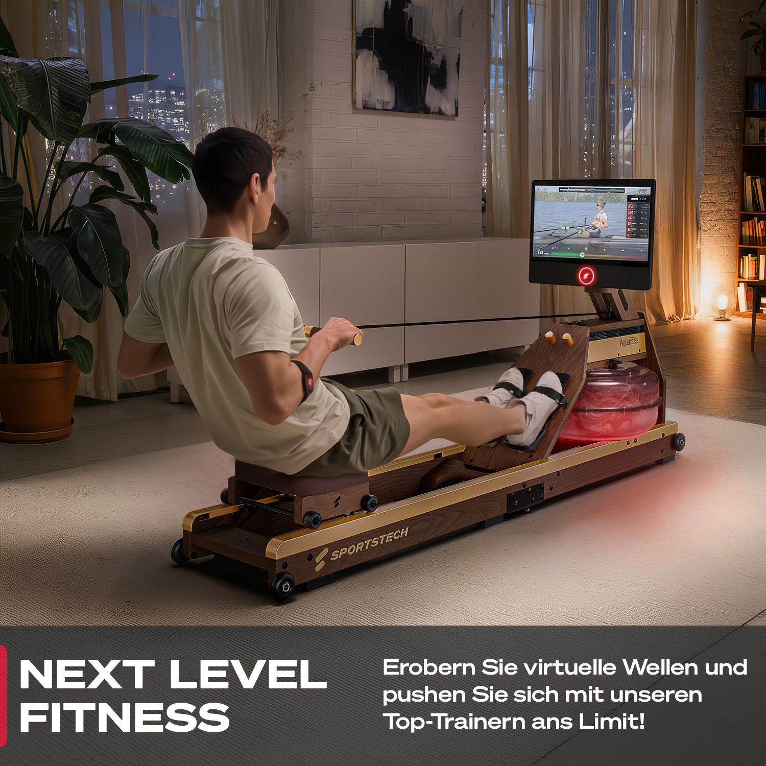 Der AquaElite ist das Premium Wasserrudergerät von Sportstech – und setzt neue Maßstäbe. Es besteht aus edlem Massivholz, verfügt über elegante Ledergriffe und bringt mit dem 21,5" HD-Touchscreen modernste Technik direkt in dein Wohnzimmer. So holst du dir das volle Sportstech Live Erlebnis nach Hause – mit geführten Workouts, beeindruckenden Landschaftsvideos, Rezepten und deinen liebsten Streaming-Diensten.
