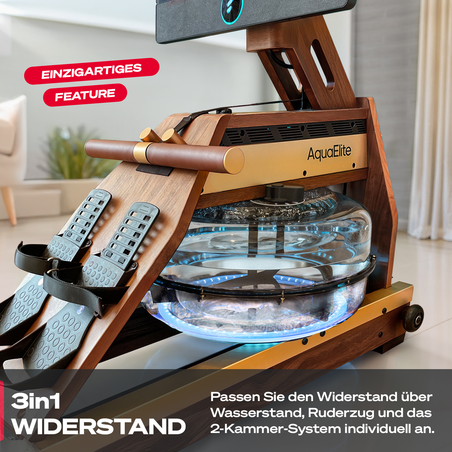 Das AquaElite verfügt über drei Möglichkeiten, den Widerstand zu regulieren. Der Widerstand kann über die Füllmenge des Wassertanks, den individuellen Ruderzug und den Regler für das 2-Kammersystem reguliert werden.