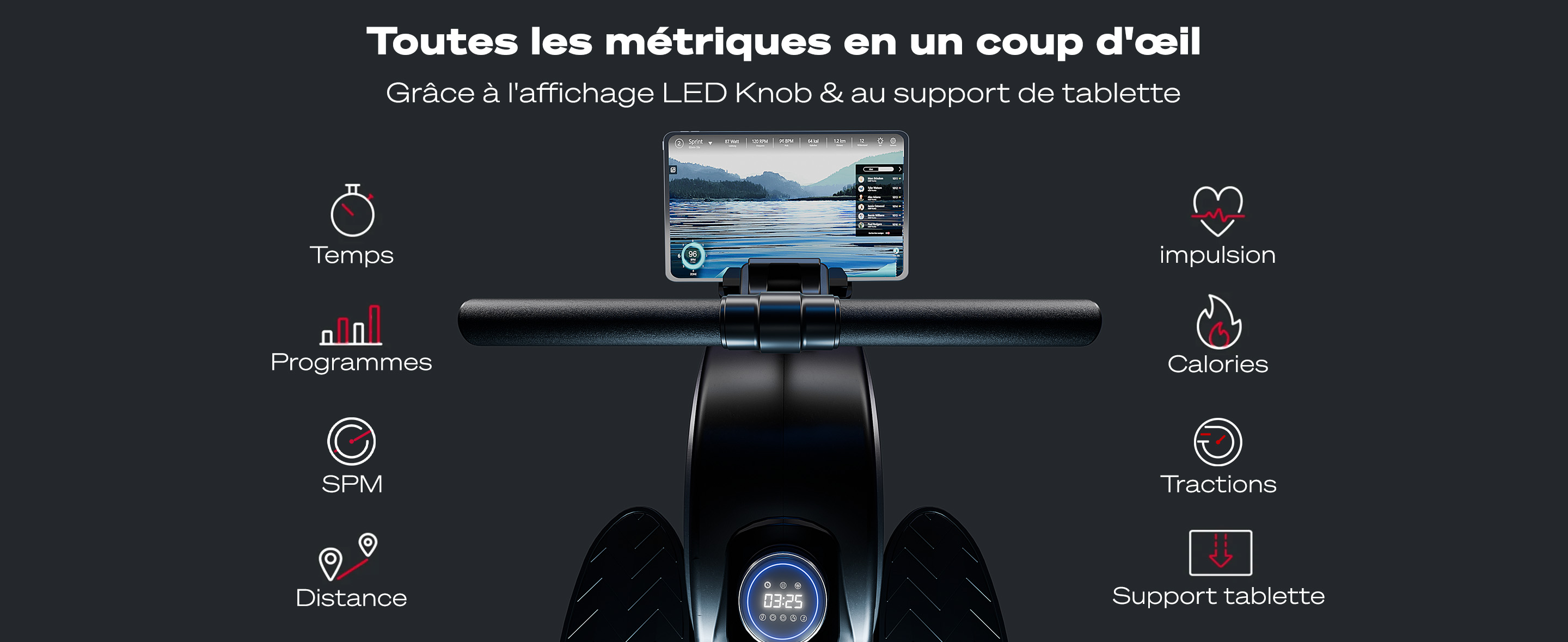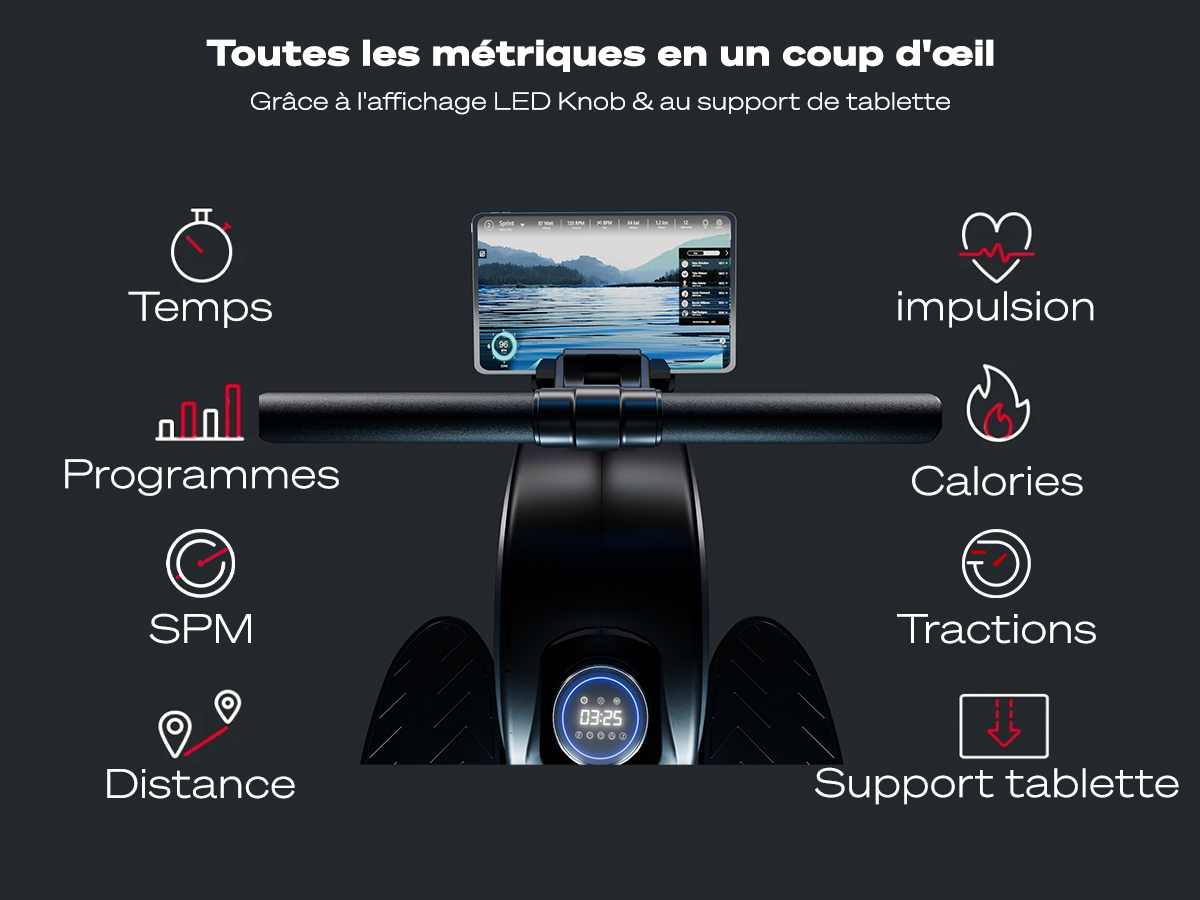 Das innovative LED-Knob-Display zeigt dir immer alle wichtigen Leistungsdaten an: Zeit, Distanz, Puls, Watt, SPM (Züge pro Minute), Kalorien, Widerstandsstufen (32 Stufen verfügbar)