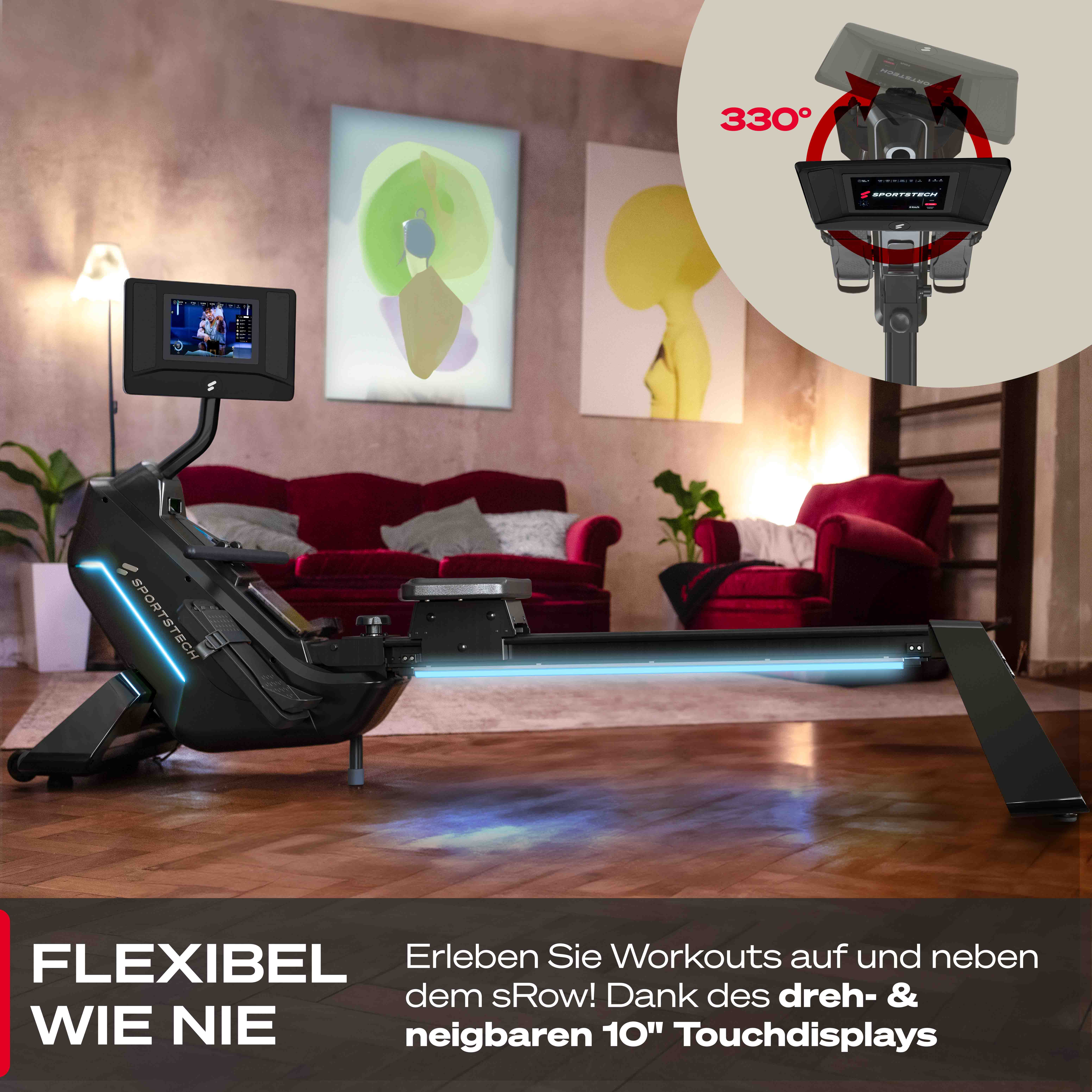 Das sRow bringt dein Training auf ein neues Level – dank integriertem 21,5″ Touch-Display und der vorinstallierten Sportstech Live App. Du hast sofort Zugriff auf hunderte interaktive Kurse, motivierende Landschaftsvideos, persönliche Trainingspläne und Live-Workouts – direkt auf dem Gerät, ganz ohne Zusatzgeräte. In Begleitung mit dem LED Feedbacksystem nach Widerstand oder Puls genießt du Studioqualität zuhause.
