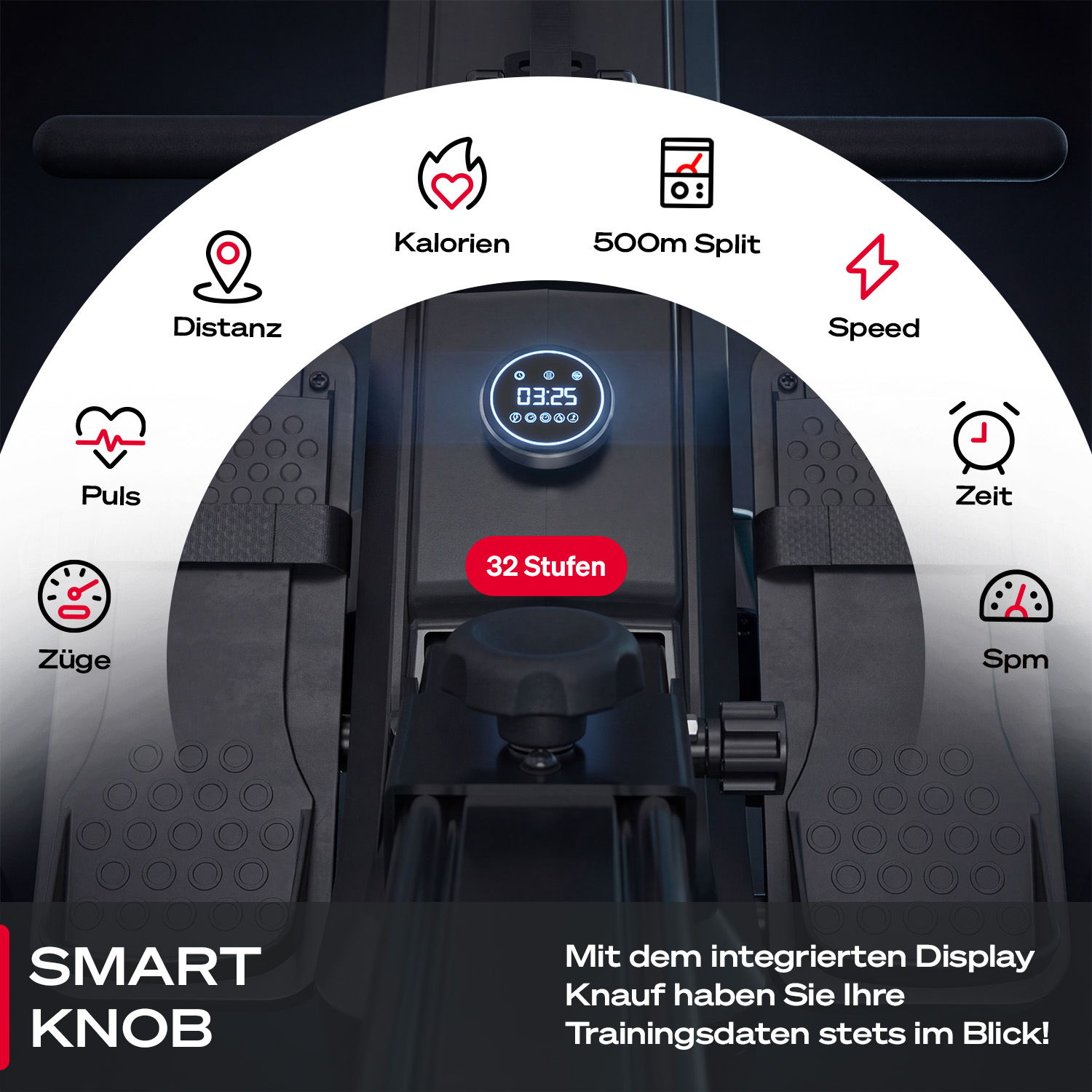 Ja, das ist möglich! Wir empfehlen dir das sPulse-Armband – speziell für unsere sRow Modelle entwickelt. Es überträgt deine Herzfrequenz in Echtzeit und integriert sich perfekt ins LED-System, das je nach Trainingsintensität die Farbe wechselt.