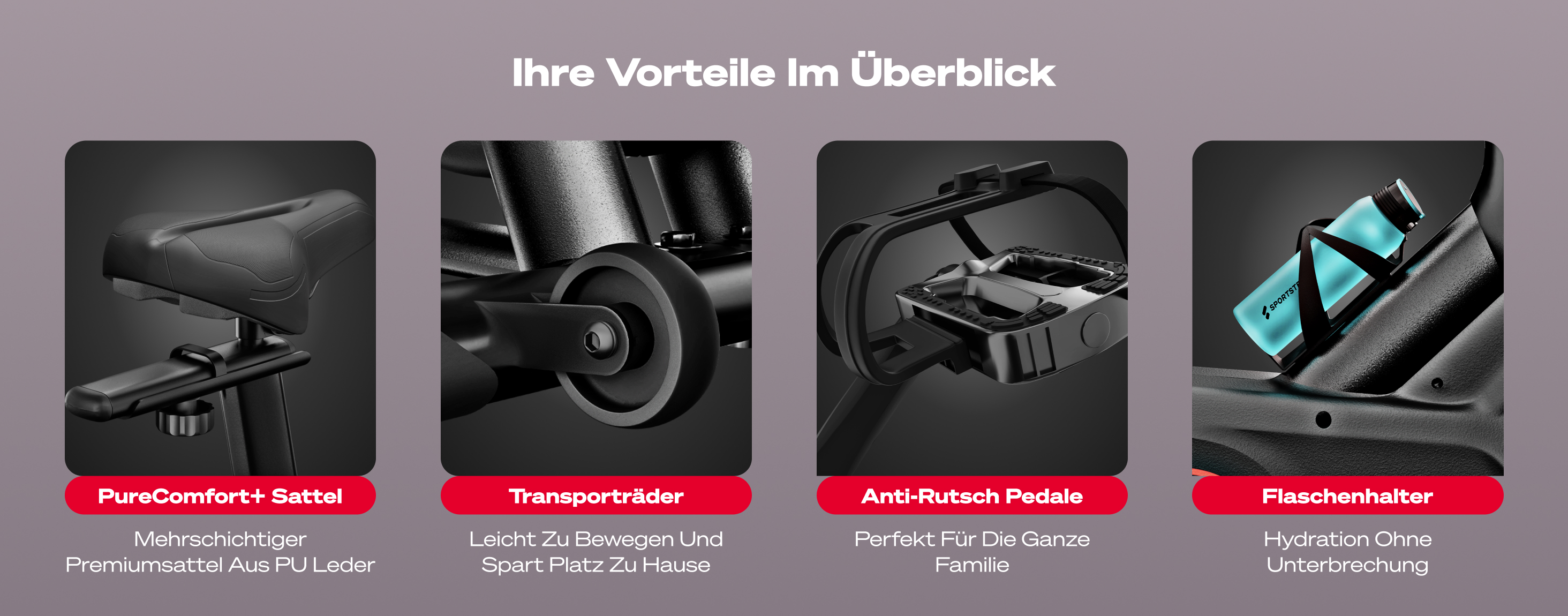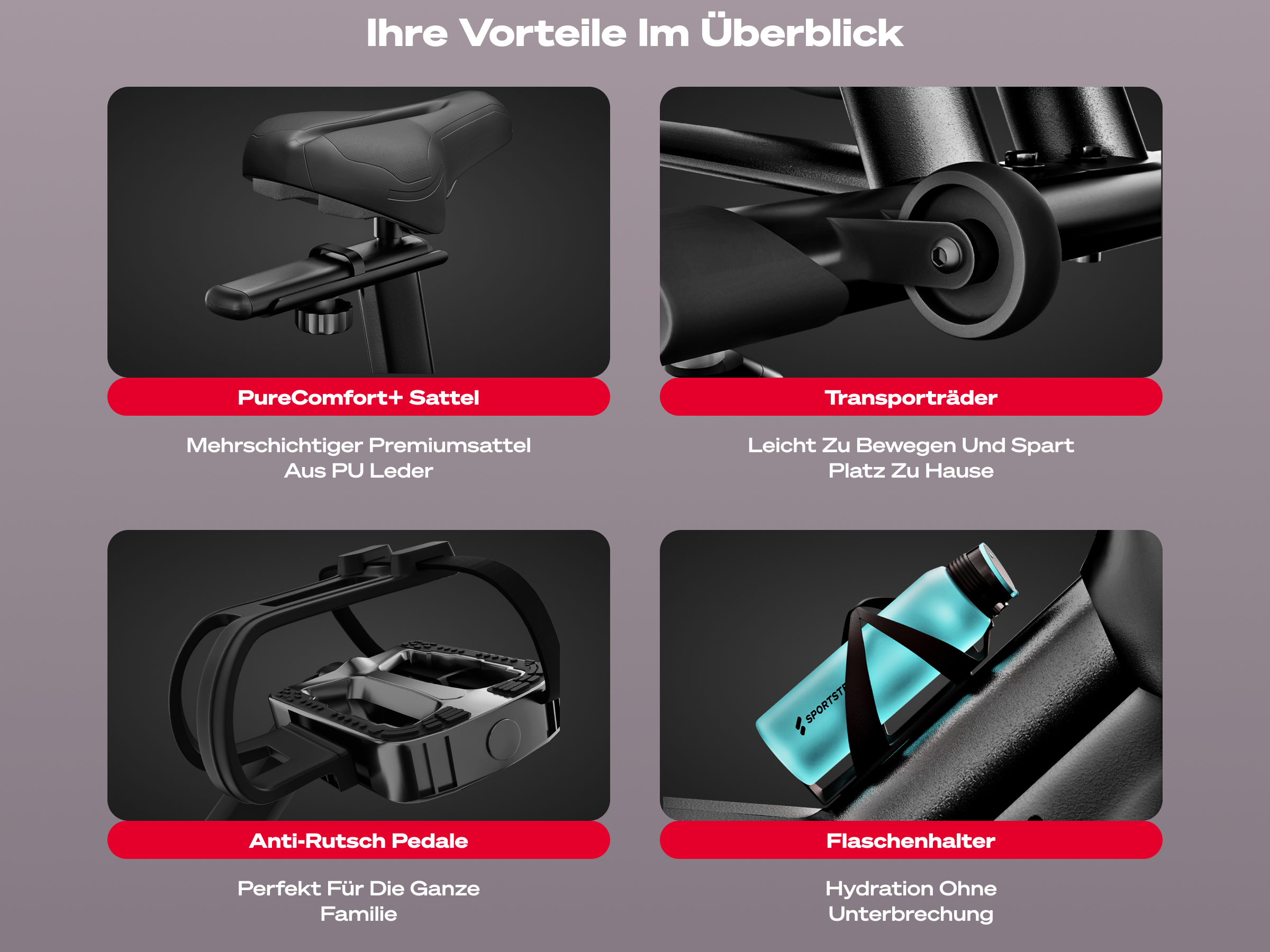 - Achtung Verletzungsgefahr: Das Schwungrad besitzt keine Freilauf-Funktion. Die Pedale drehen sich weiter, auch wenn du aufhörst zu treten.