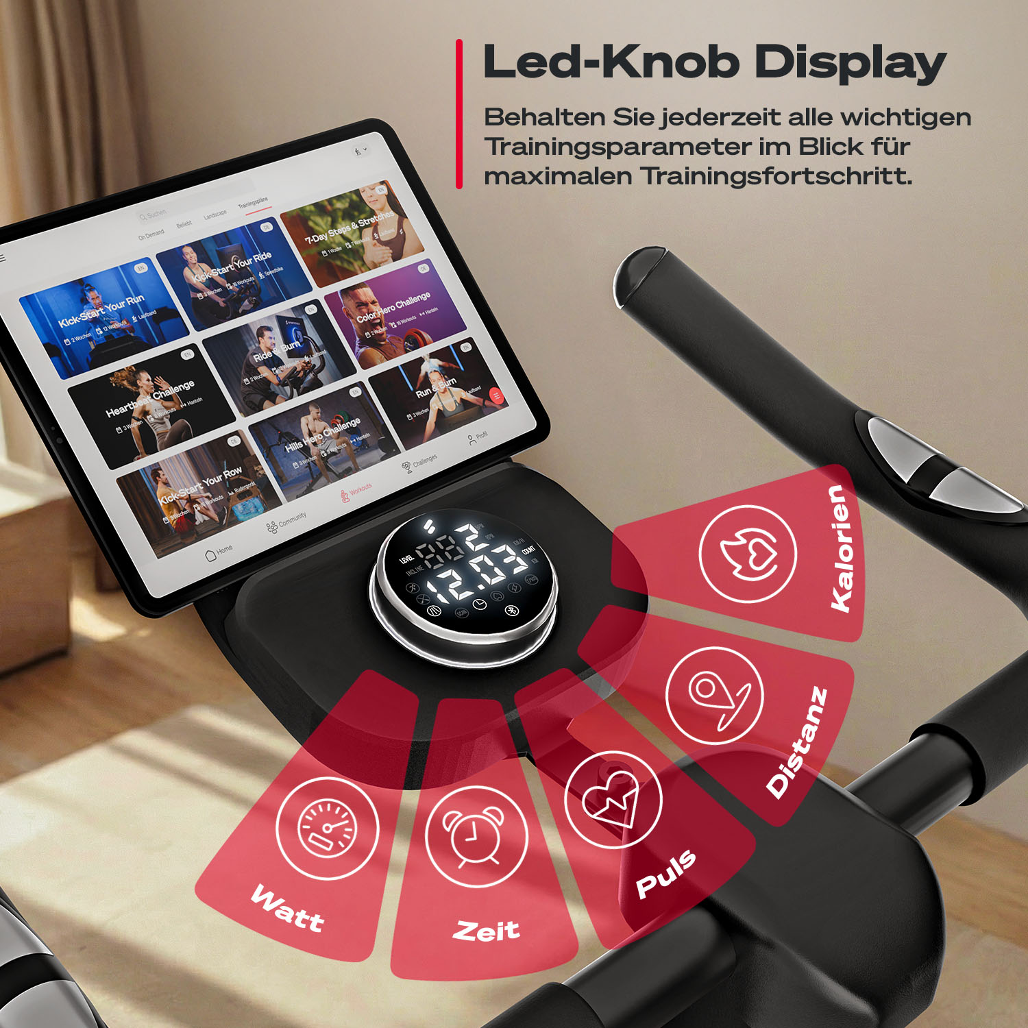 Die moderne LED Knob-Display zeigt dir Zeit, Geschwindigkeit, Distanz, Kalorien, Puls und Herzfrequenz an. Mit der SCAN Funktion wechselt die Anzeige automatisch alle 4 Sekunden zwischen den einzelnen Werten.