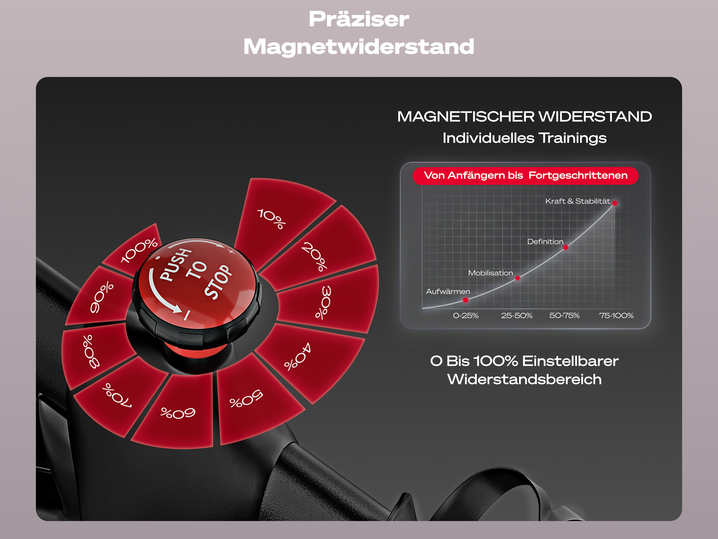 Ein Magnetbremssystem bietet den Vorteil eines leisen Betriebs und einer gleichmäßigen, präzisen Widerstandseinstellung. Es verursacht keinen Verschleiß an Bremsbelägen und ist wartungsarm, was zu einer längeren Haltbarkeit und besserem Komfort führt.
