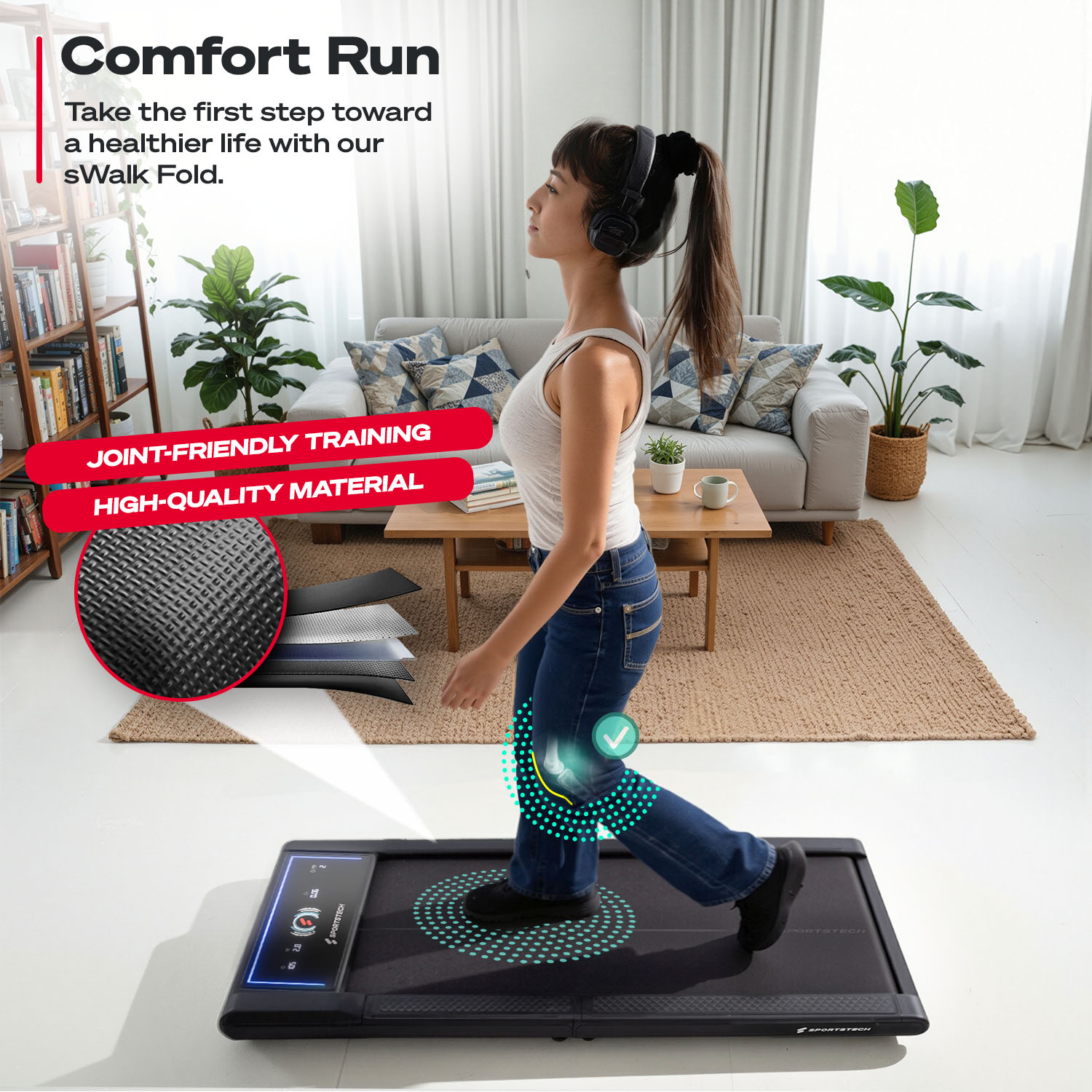 Das sWalk Fold ist ein einzigartiges Walking Pad. Es sticht hervor durch sein edles Design, seine Funktionalität und seine Variabilität. Du kannst es vielseitig einsetzen: Ob unterm Schreibtisch beim Arbeiten oder abends ein paar Schritte gehen vor dem Fernseher. Mit der integrierten Faltfunktion lässt es sich zudem mühelos verstauen und passt in jede Wohnung.
