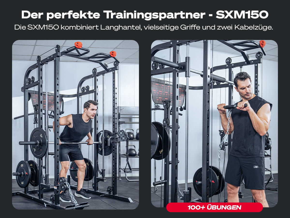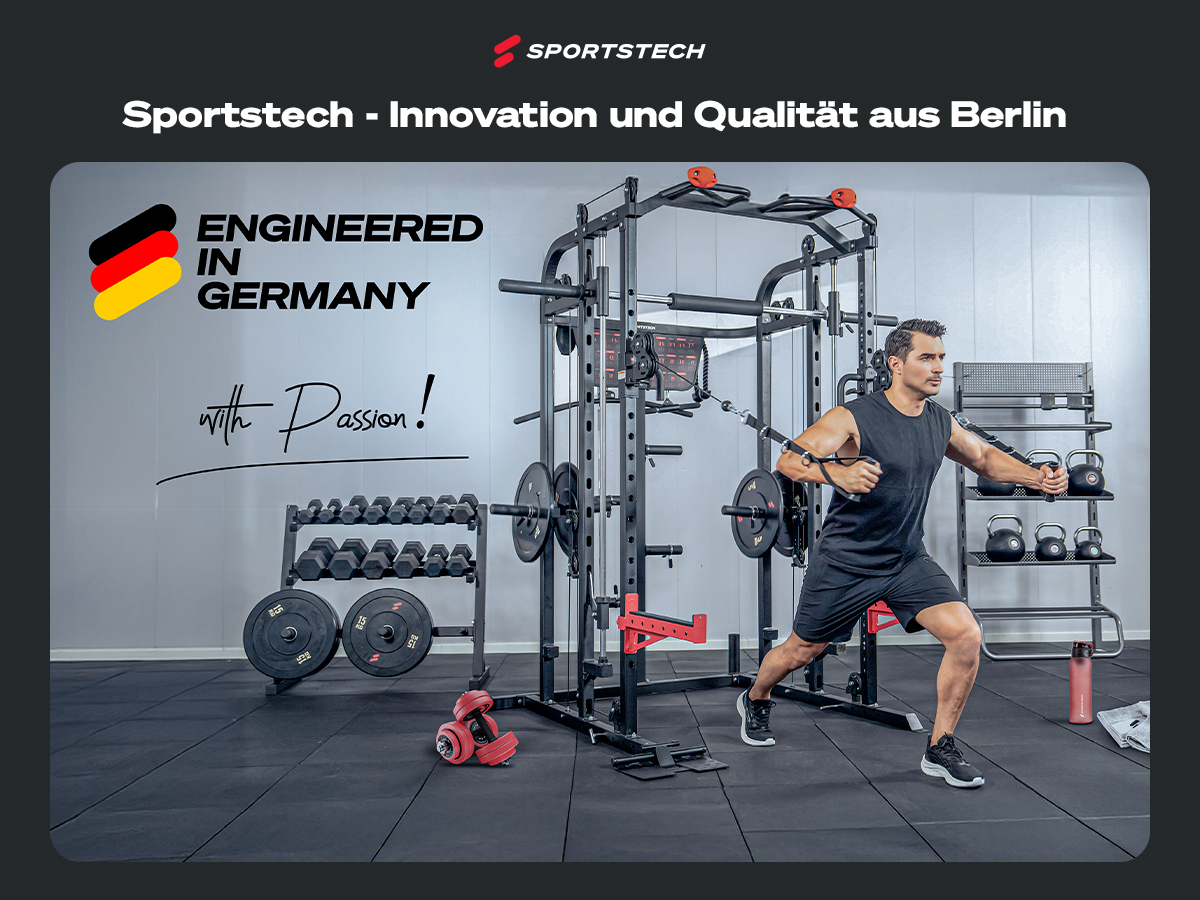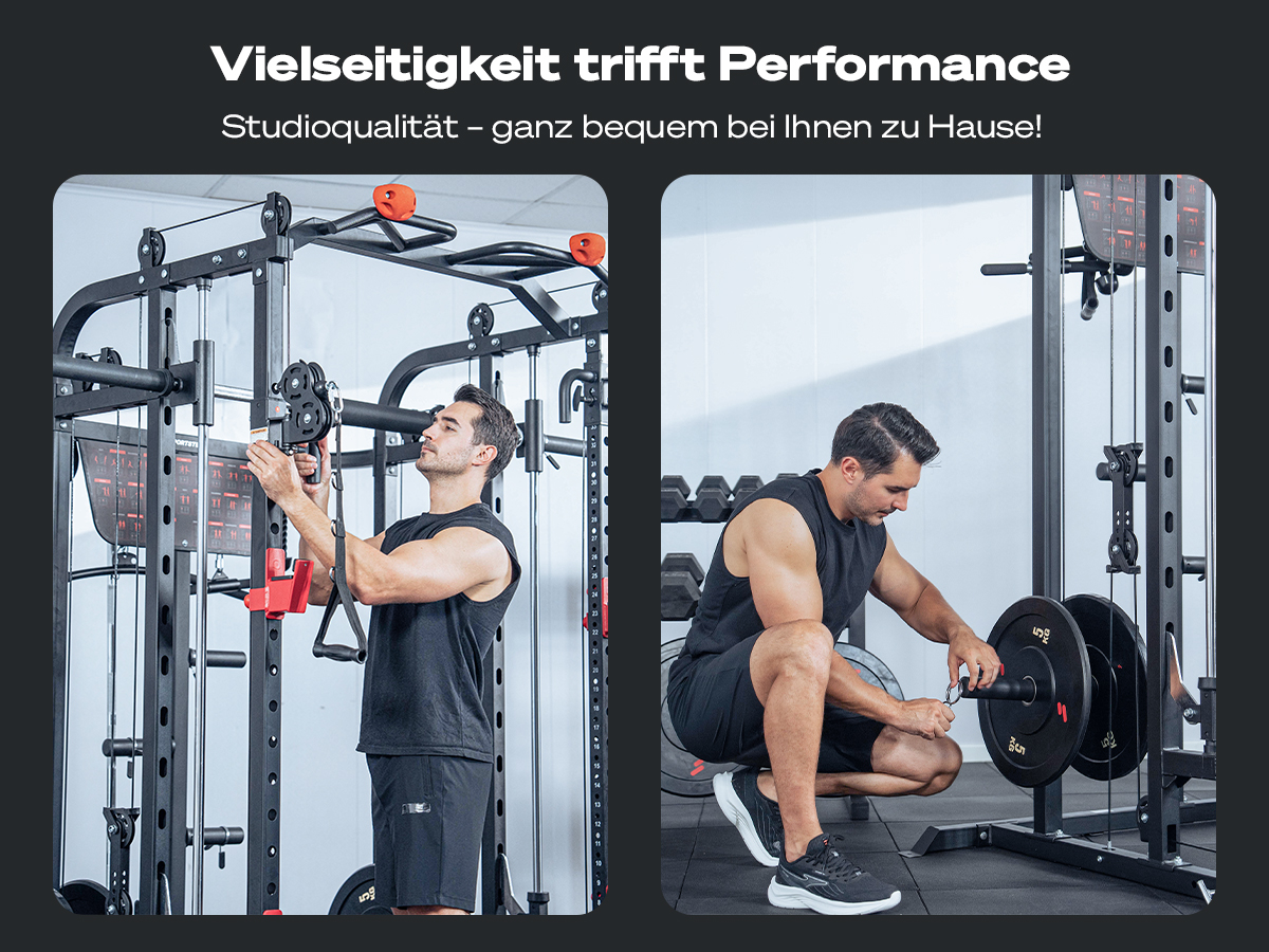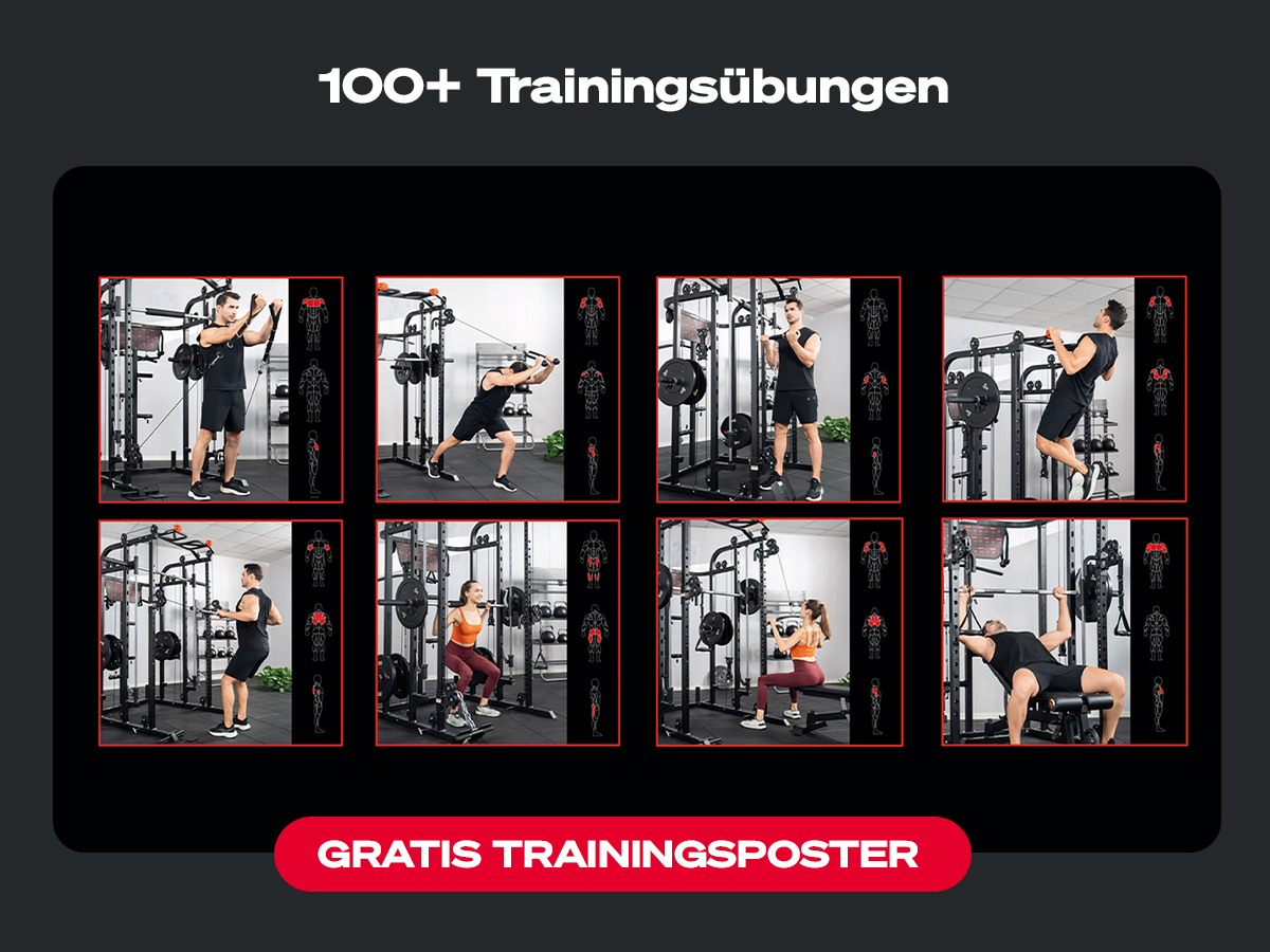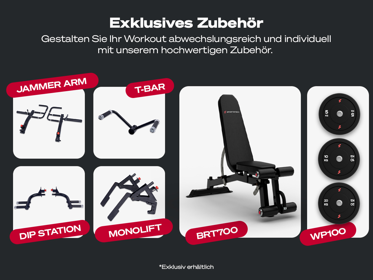 - Optional exklusives Zubehör: Hantelbank, Bodenschutz, Gewichtsscheiben, Trainingsgriffe und vieles mehr