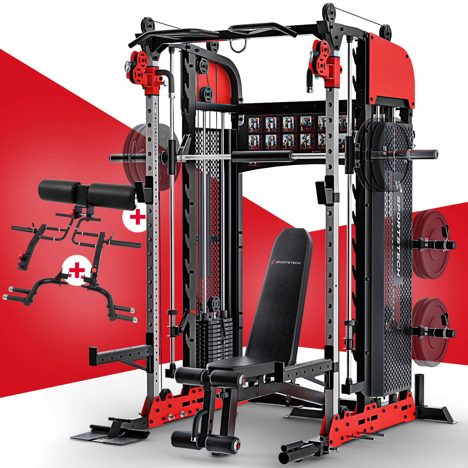 Bei der SXM200 können Sie nicht nur mit Gewichtsscheiben, sondern auch mit insgesamt 140kg Gewichten an der Station trainieren. Außerdem können sie eine Beinpresse an der geführten Langhantelstange montieren für Beindrücken bis 136kg.