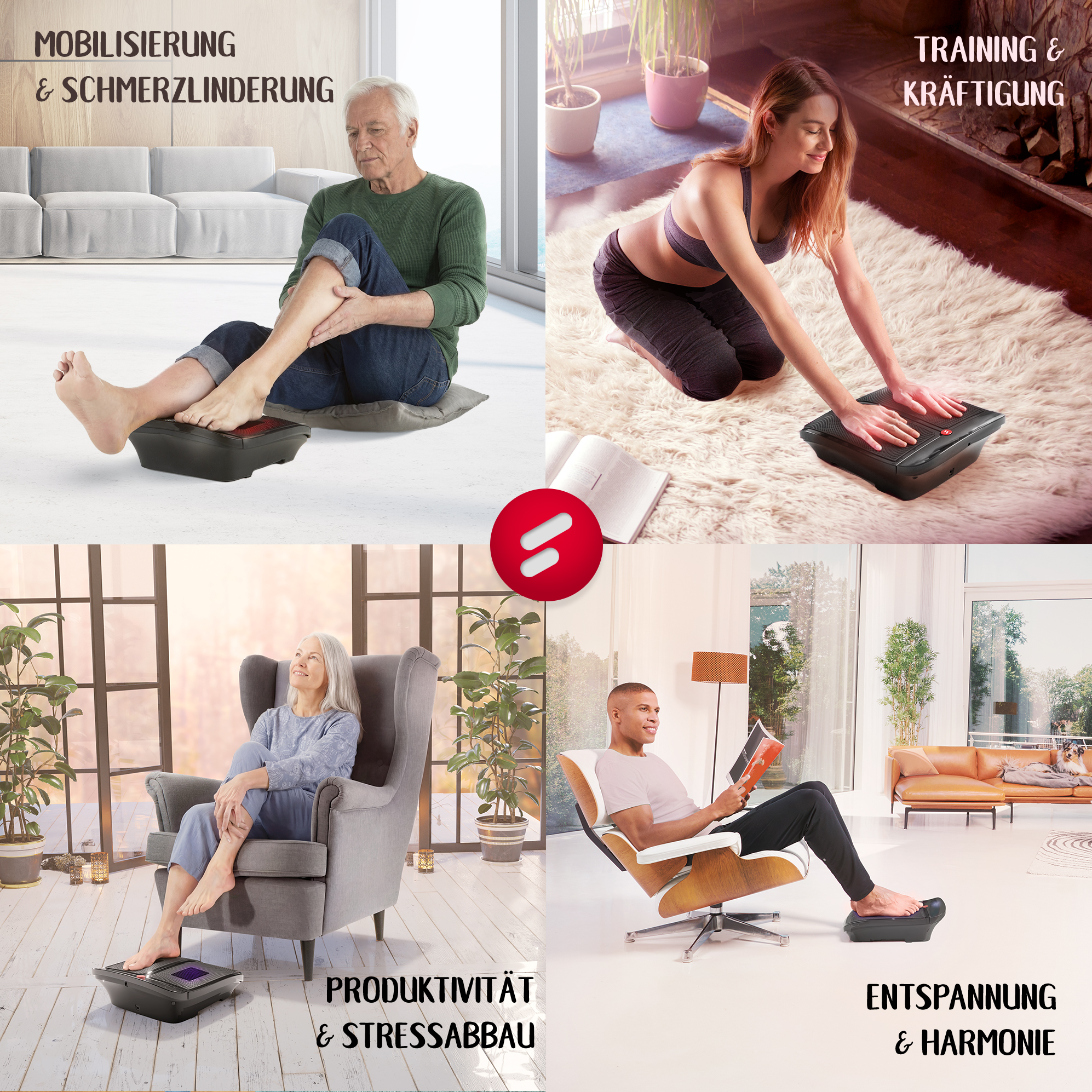 In unserem Alltag sind wir ständig auf den Beinen, wenn wir von Freizeitaktivität zu Termin und danach zum sportlichen Ausgleich ins Fitnessstudio laufen. Damit sich unsere beanspruchten Füße nach einem langen Tag erholen können, ist die Vibrationsplatte VX350 mit wirksamen Akupressur-Massageköpfen für eine intensive Massage versehen. Diese regen die Blutzirkulation an und stimulieren die Reflexzonen – lästige Verspannungen gehören der Vergangenheit an. Alles, was du dafür tun musst: Einfach die Füße hochlegen und in vollen Zügen genießen!