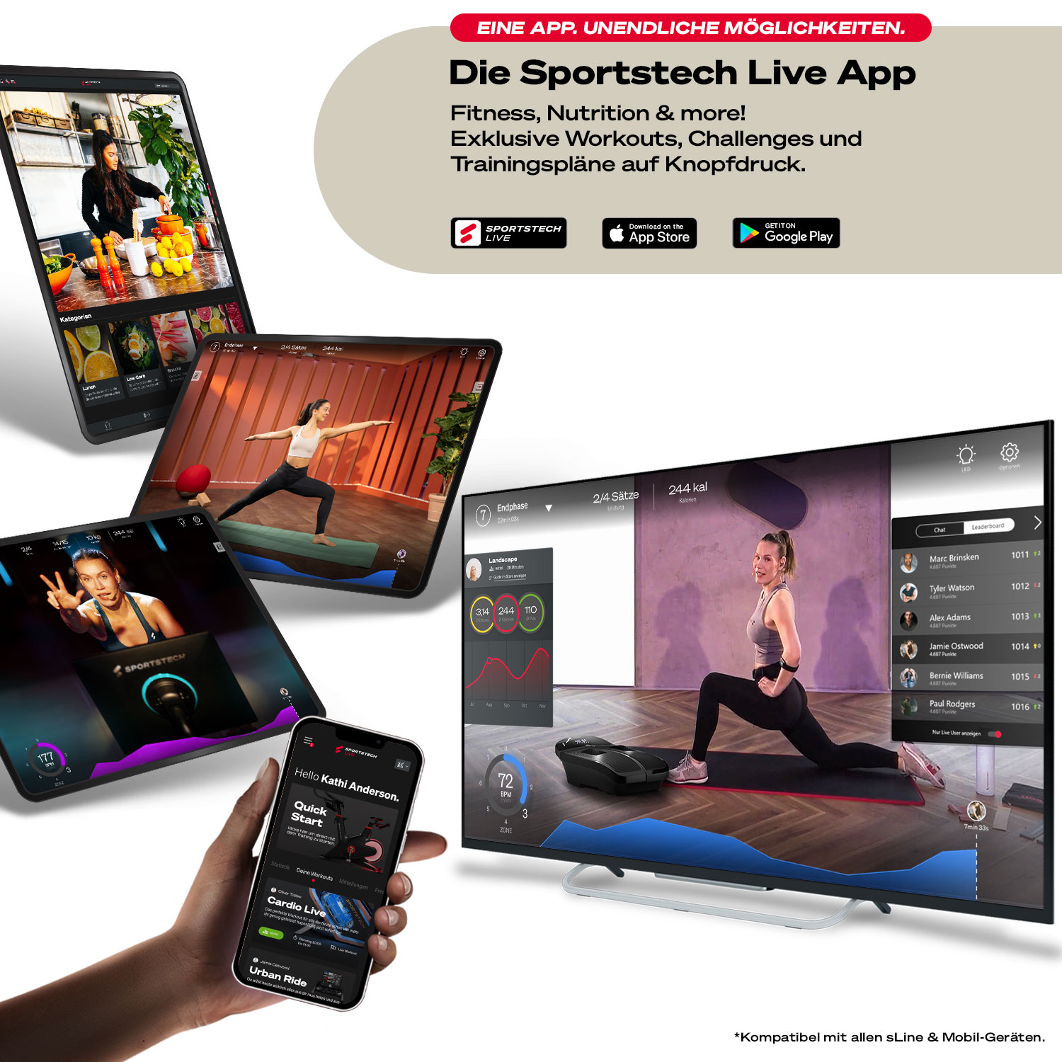 - Mit Sportstech Live App, Kinomap und Zwift kompatibel