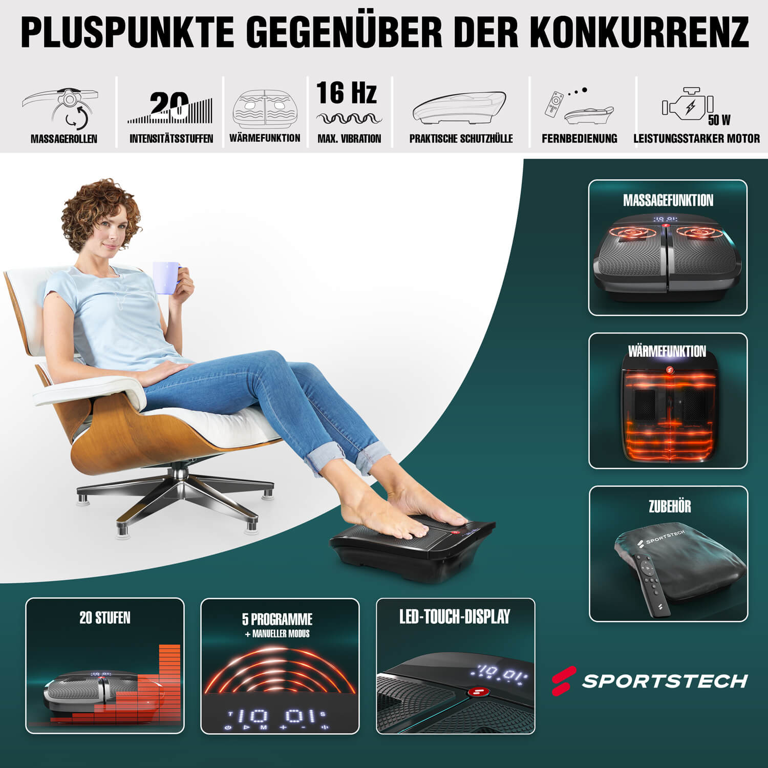 Wir alle kennen das Sprichwort „Vorsorge ist besser als Nachsorge!“. Darum haben wir von SPORTSTECH es zu unserem Auftrag gemacht, dass Menschen aller Fitnesslevel und Altersklassen sich mit unseren Produkten beweglich und gesund halten können. Die VX350 Vibrationsplatte unterstützt einen aktiven Lebenswandel, indem die stimulierenden Massageköpfe die Durchblutung anregen und Verspannungen effektiv lösen. Die Vibrations-Massage beugt zudem Krampfadern vor und ist extrem gelenkschonend – so kann jeder spielend leicht etwas für seine Fitness tun!